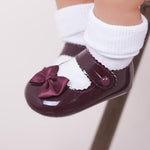 Baby girls Burgundy button bow patent pram shoes also available in Red , Black,White, Ivory & Pink perfect for a parties and special occasions.