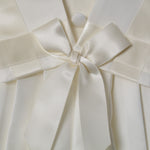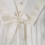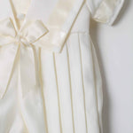- Romper: This ivory satin romper has a large sailor style collar with satin ribbon trims and bow, with mock buttons down the front of the chest. The legs of the romper are pleated. Short sleeves are trimmed with satin ribbon, with a button fastening on the back and legs for easy removal / changing.