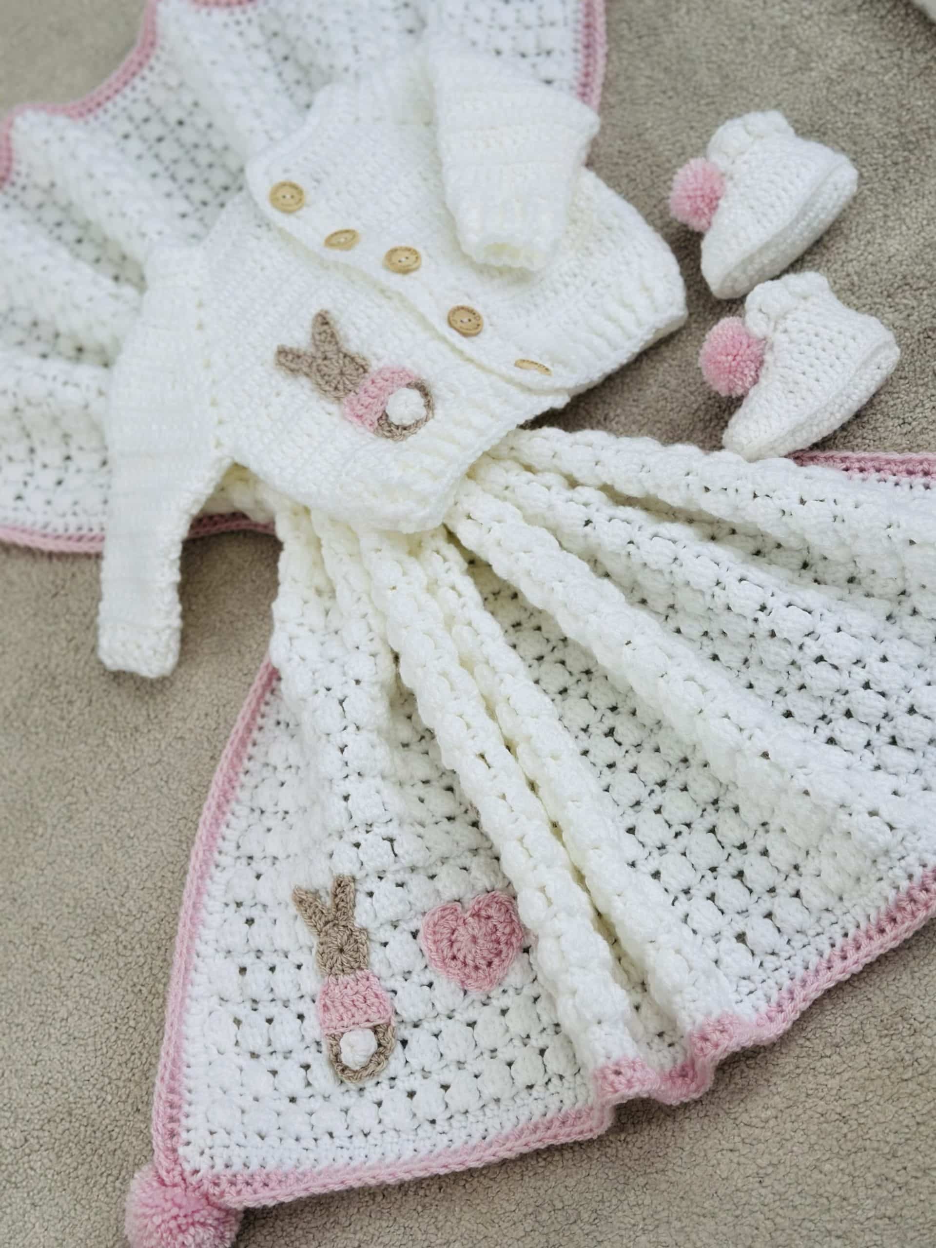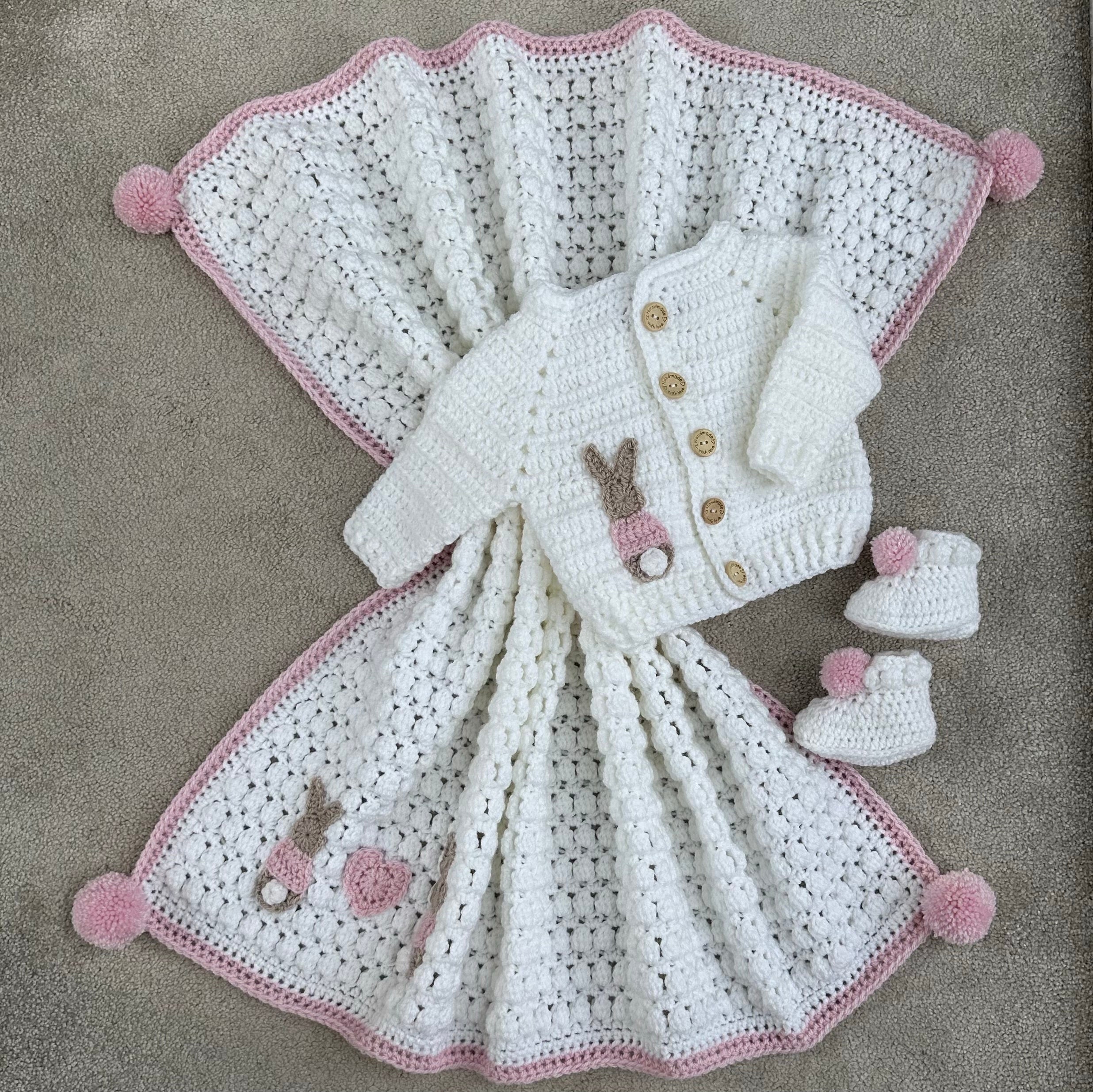 Handmade Flopsy Rabbit Cardigan and Blanket. This item is exclusive to us we make them in house. This is made from Aran wool crochet with love. Perfect Easter gift, perfect for baby showers or births. Will be a beautiful coming home item.