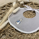 Boys beautiful Grey cotton bib from babidu with peter rabbit embroidered.
