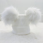 The pom poms are Faux typically made from synthetic polymeric fibers such as acrylic, modacrylic, and/or polyester. The hat is made from Acrylic.