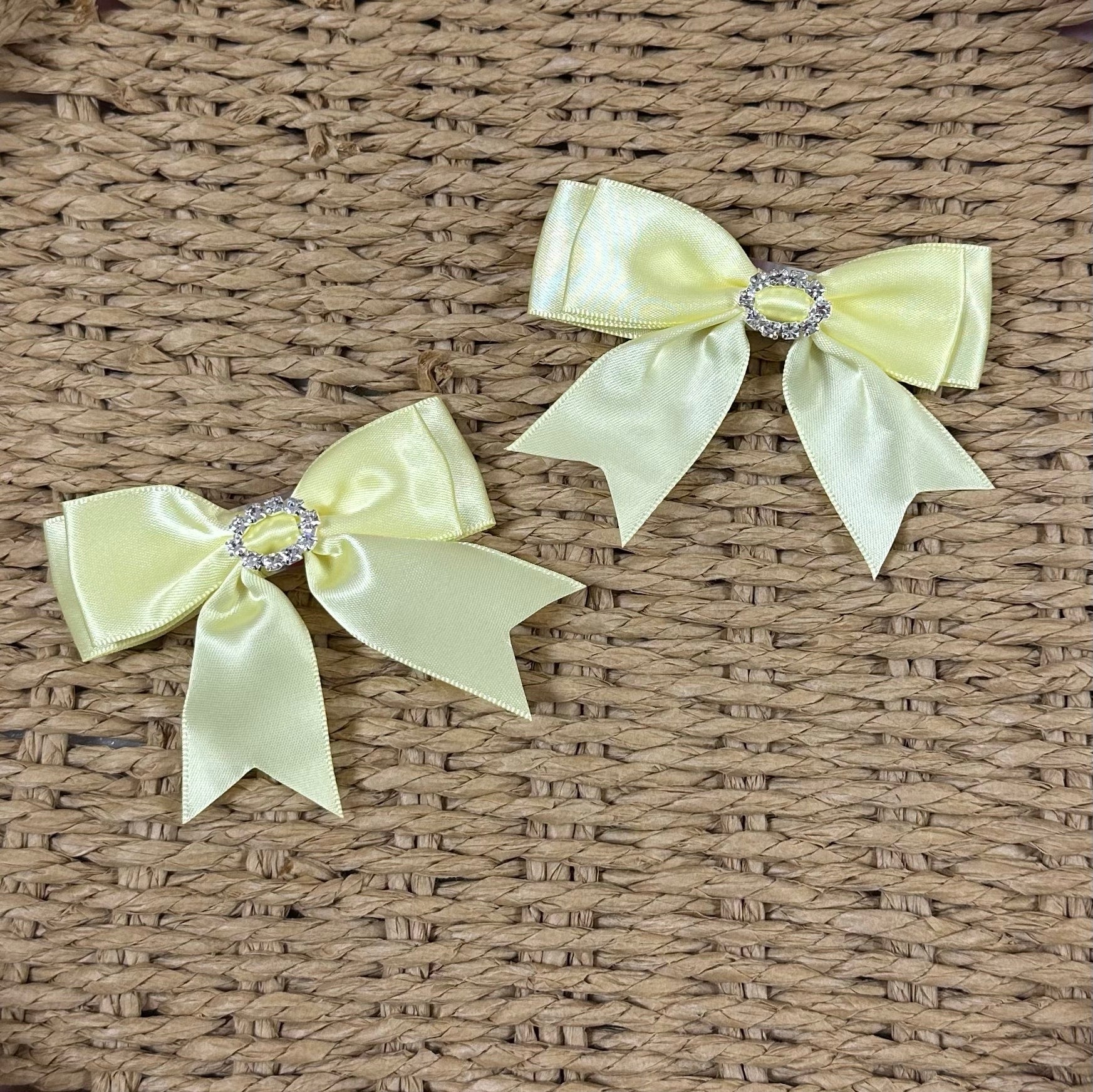Beautiful little girls hair clip, Satin Double bow with diamonds on. These are on a Rectangle Snap Clip. Twin pack of 2, 25mm Bow.