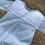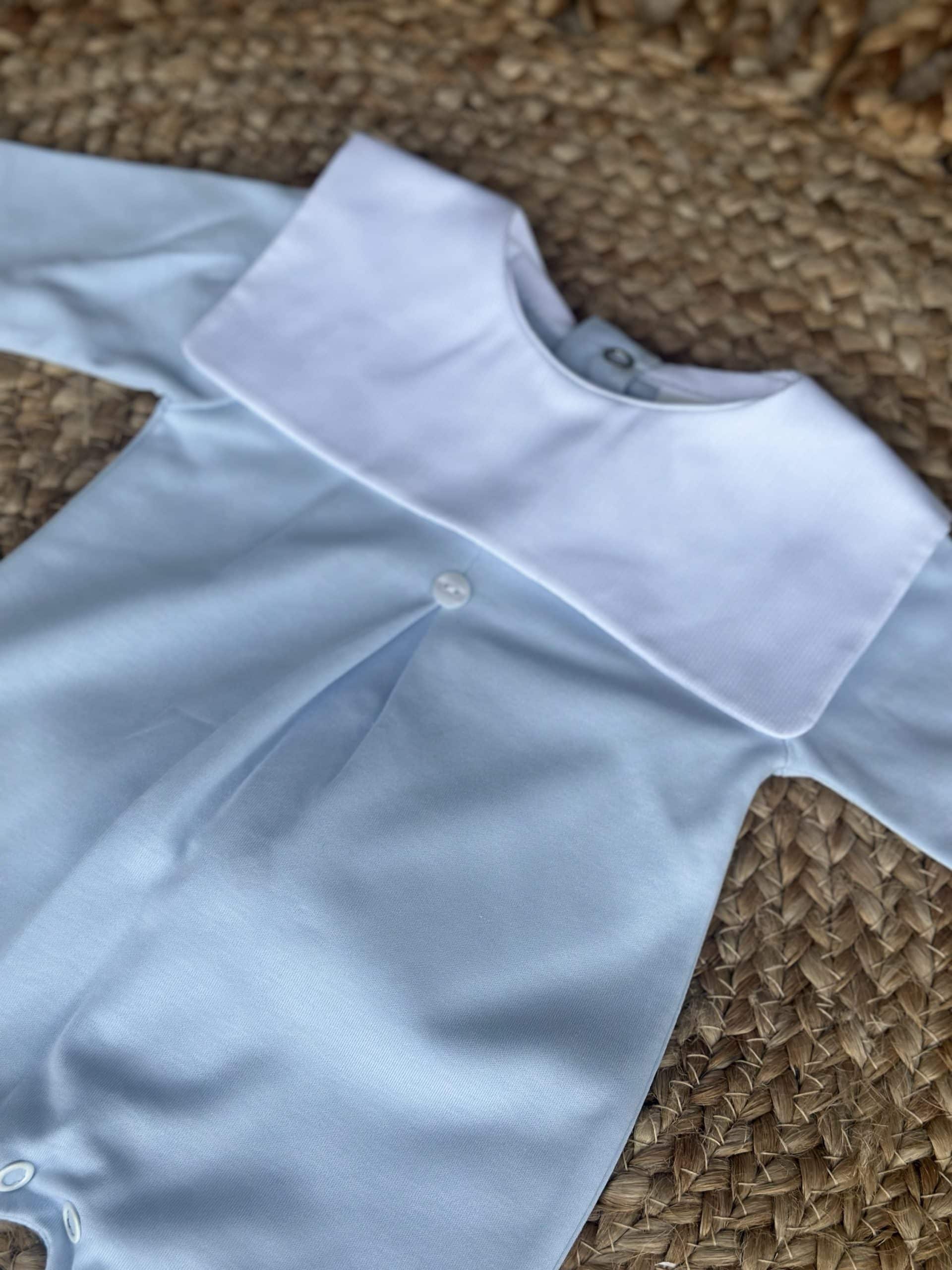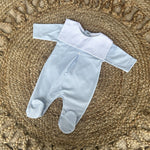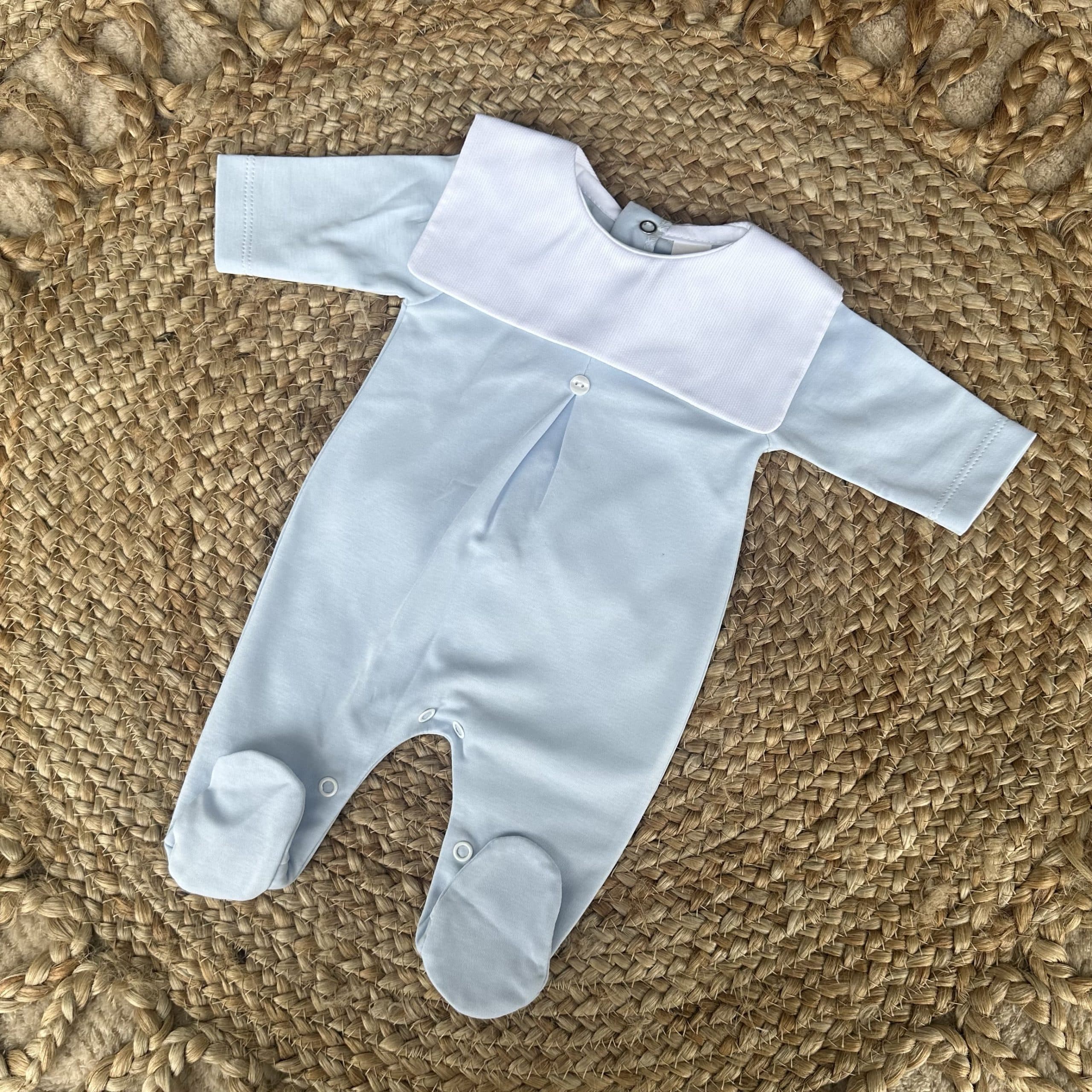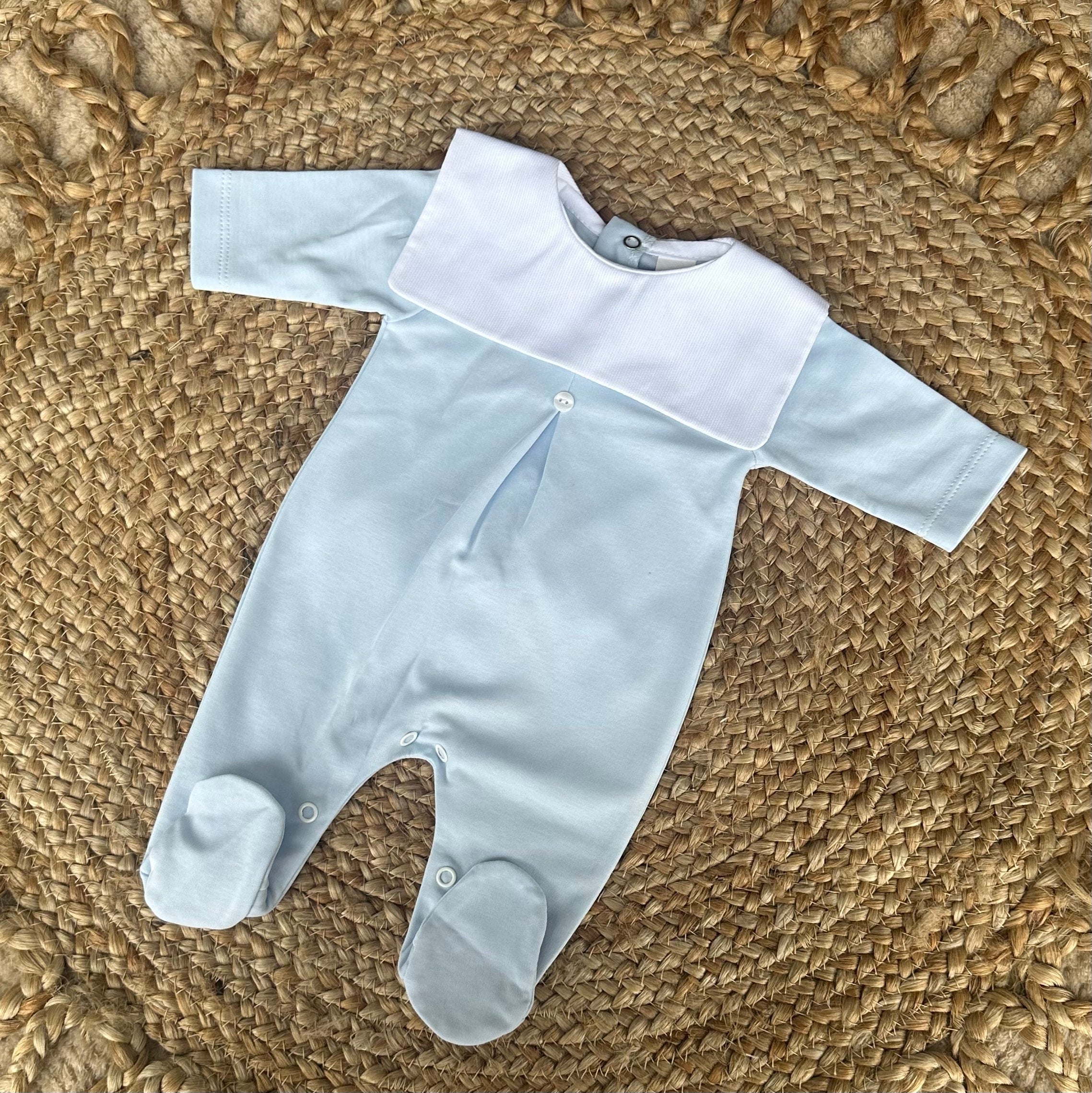 A long sleeve babygrow with a square bib, button detail with inbuilt feet.