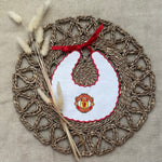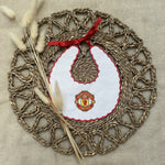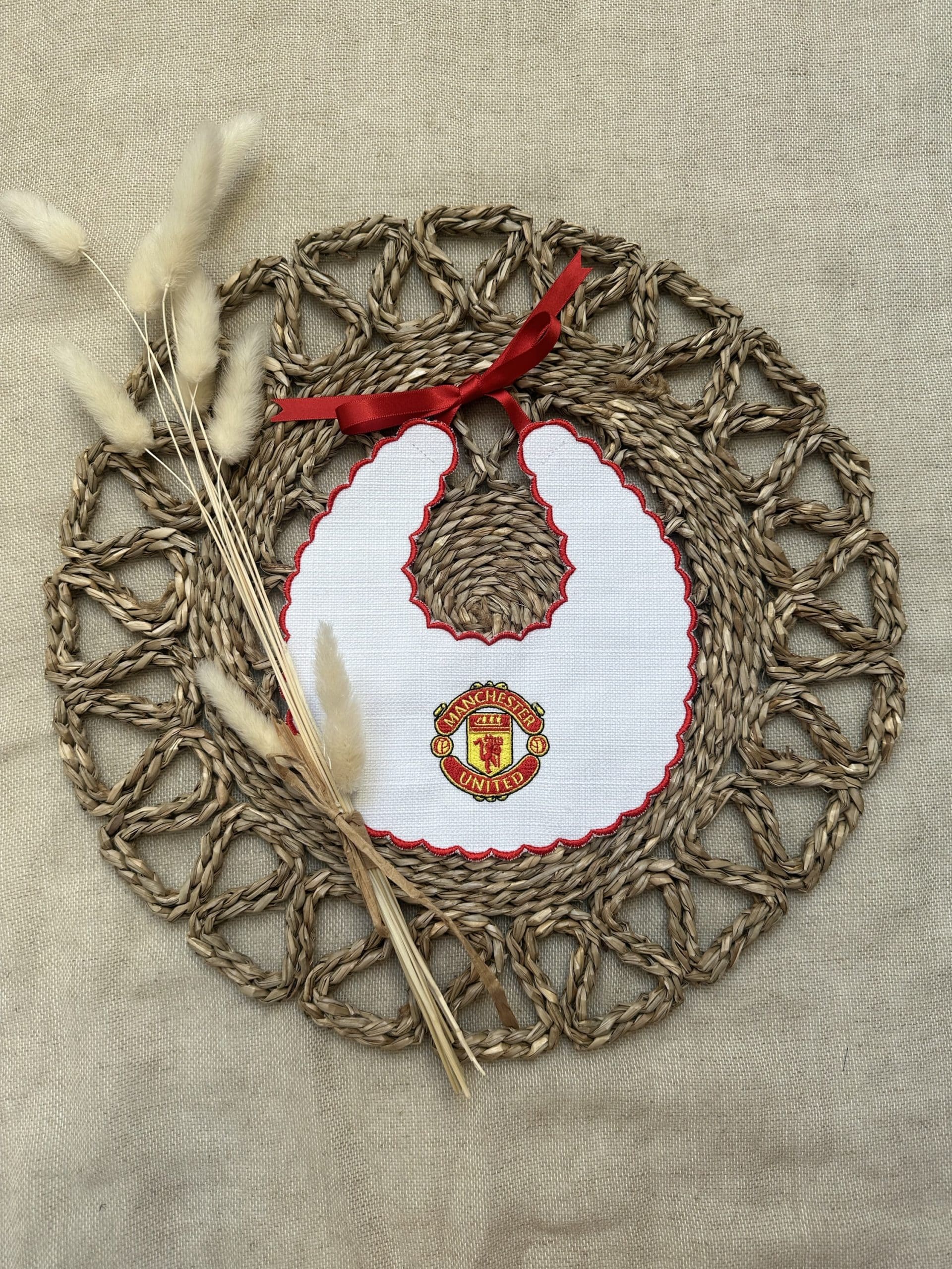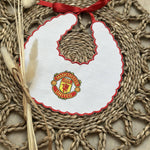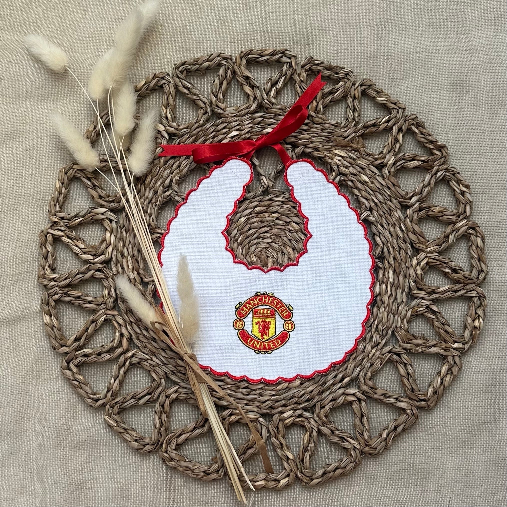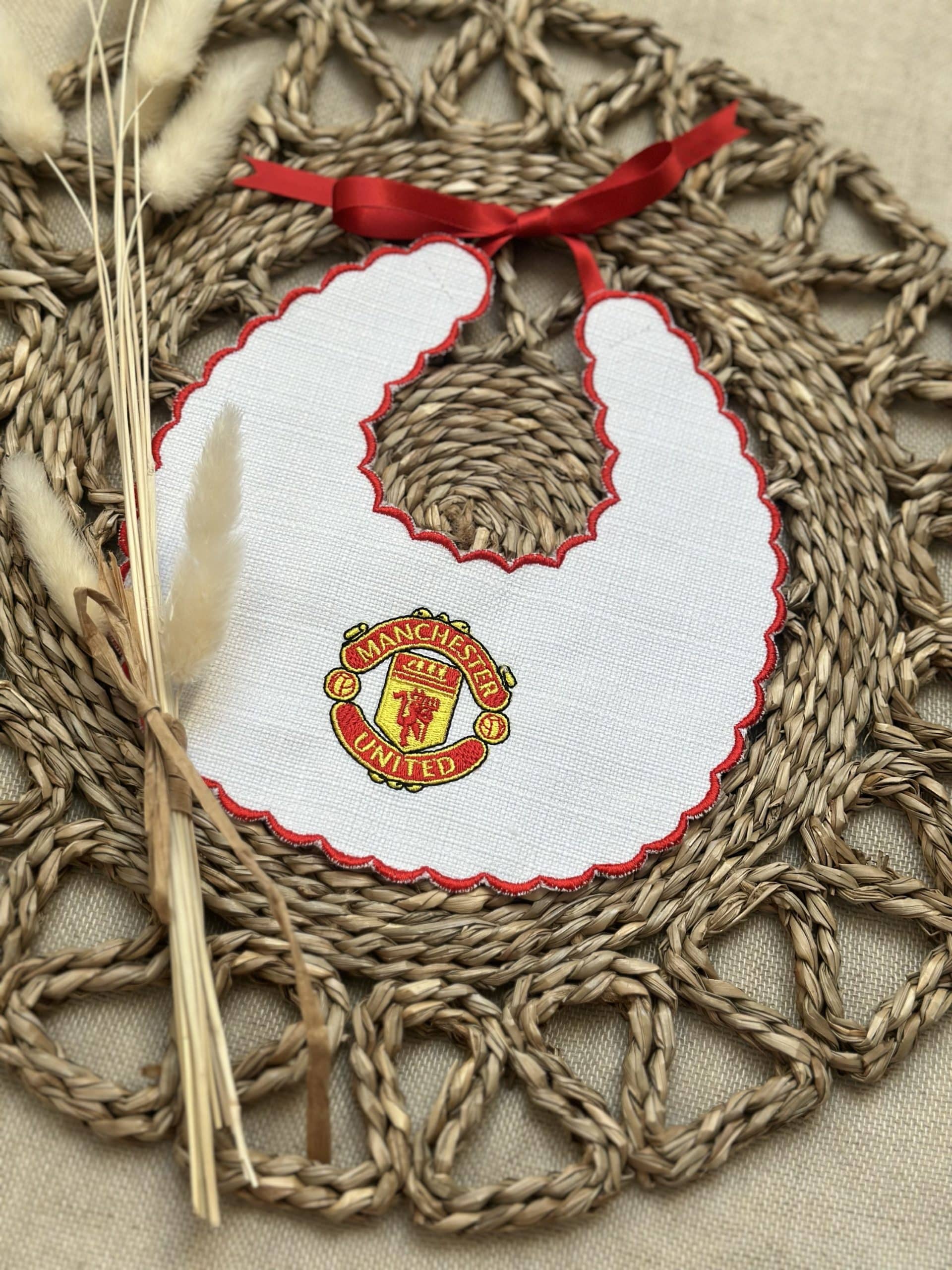 This is a one off product! absolutely stunning bib handmade with embroidered football badge. This is thin material and is used for show or photos. We don't recommend washing.