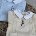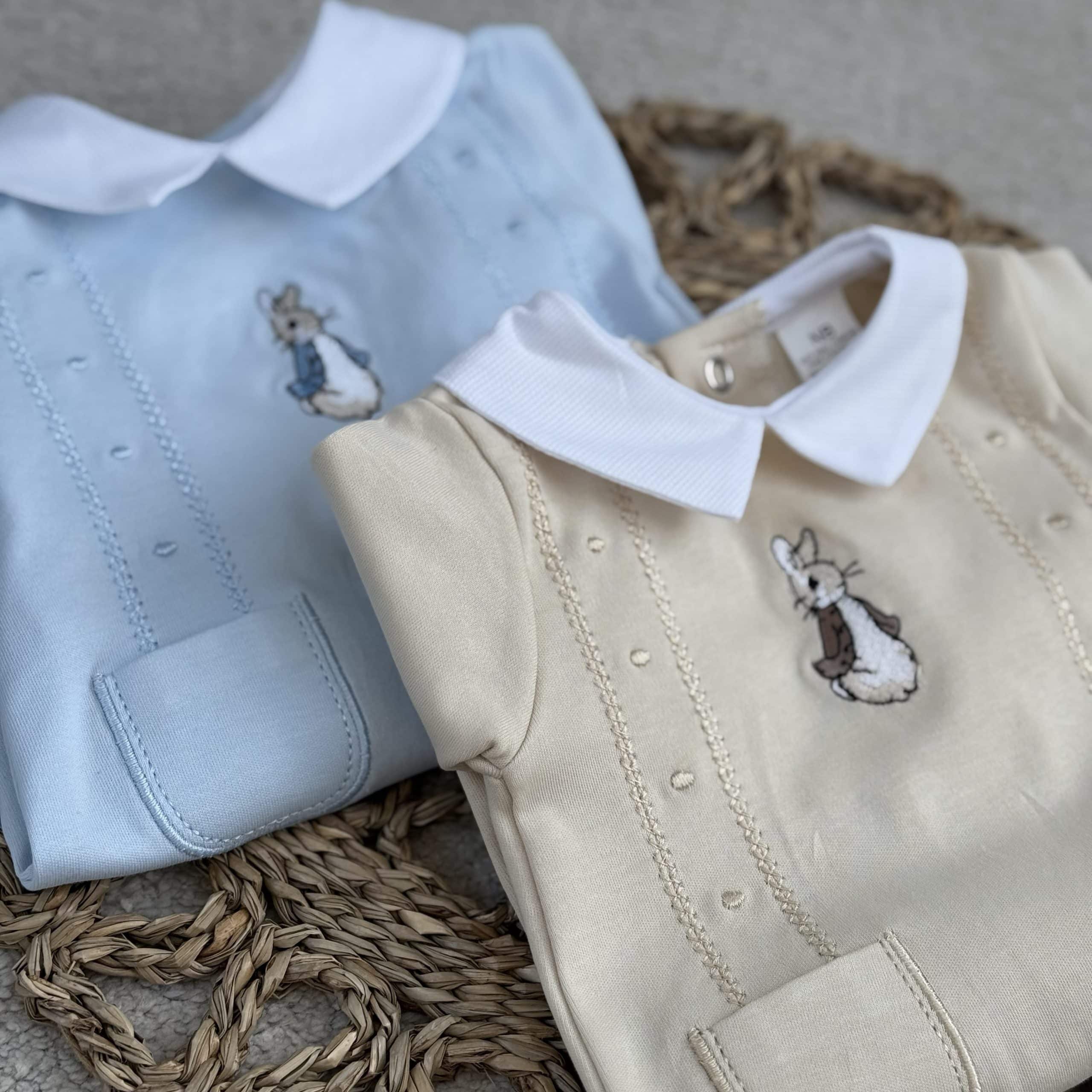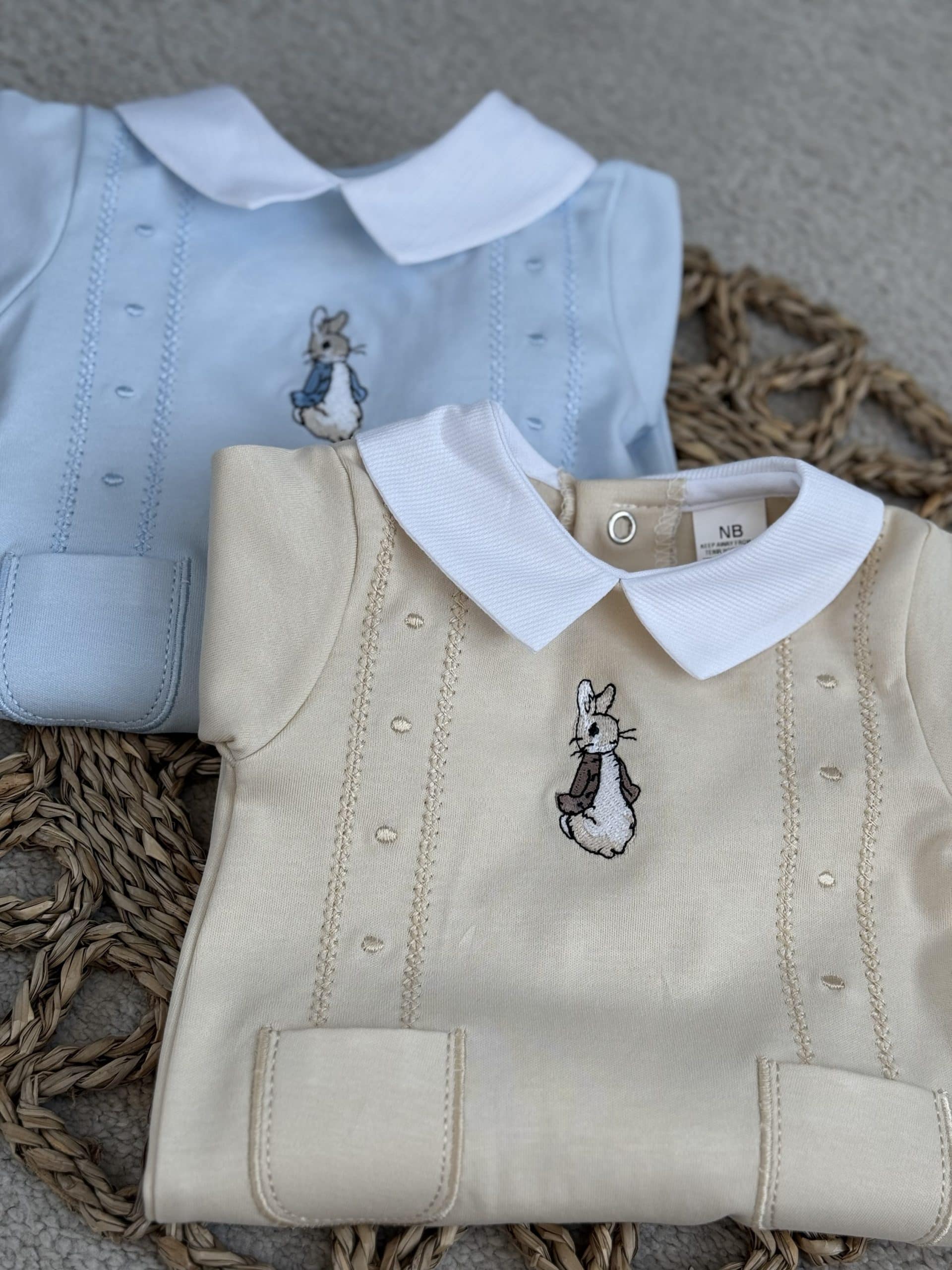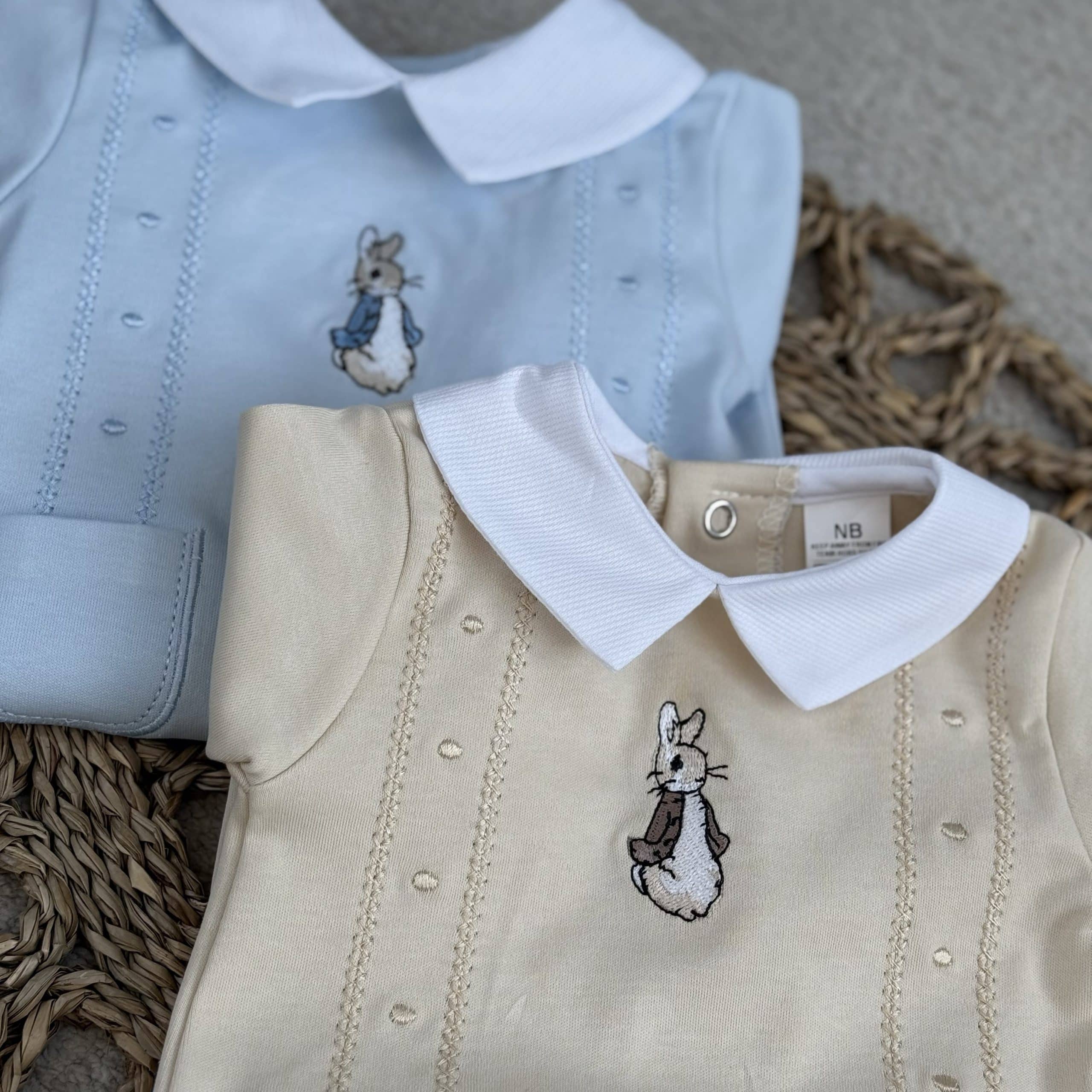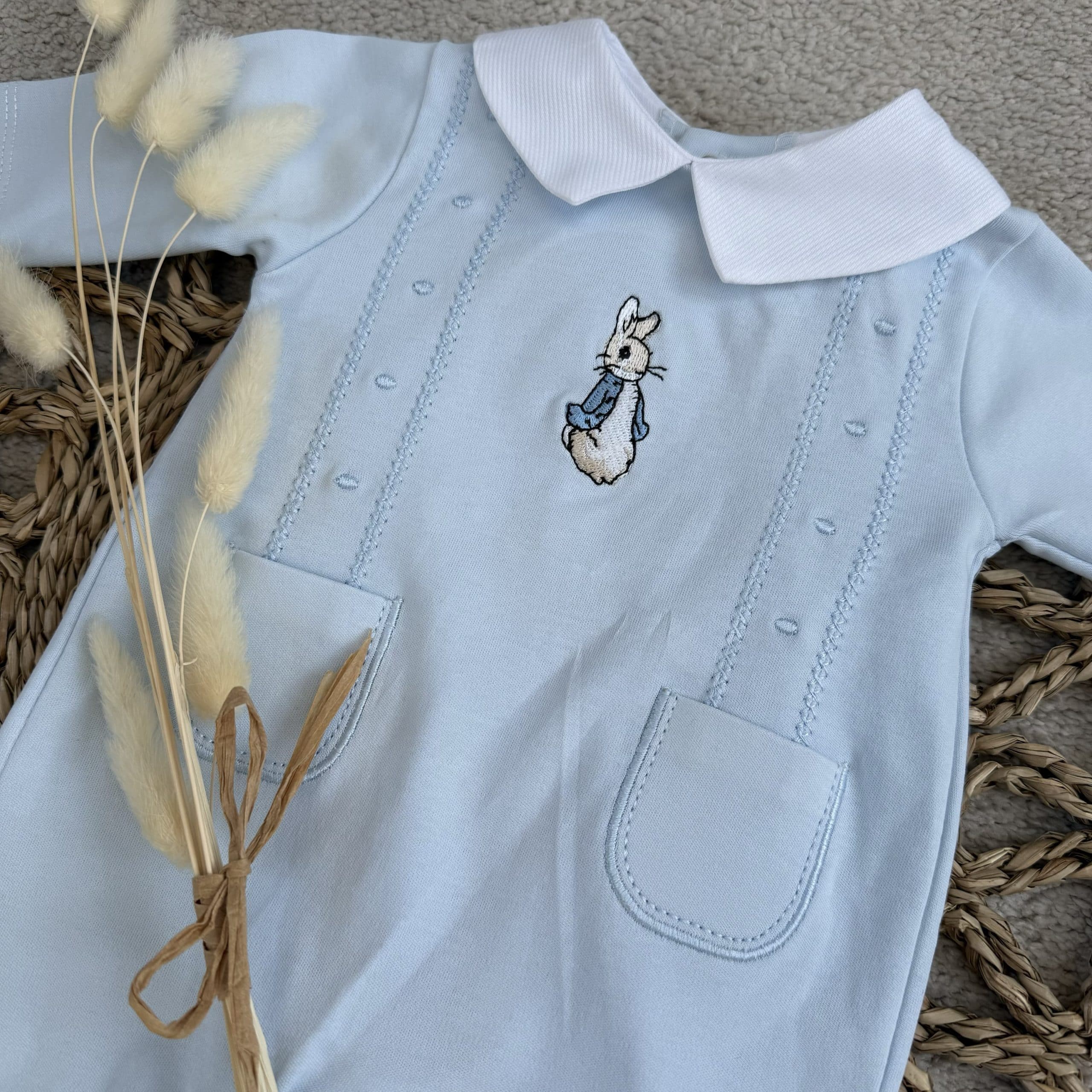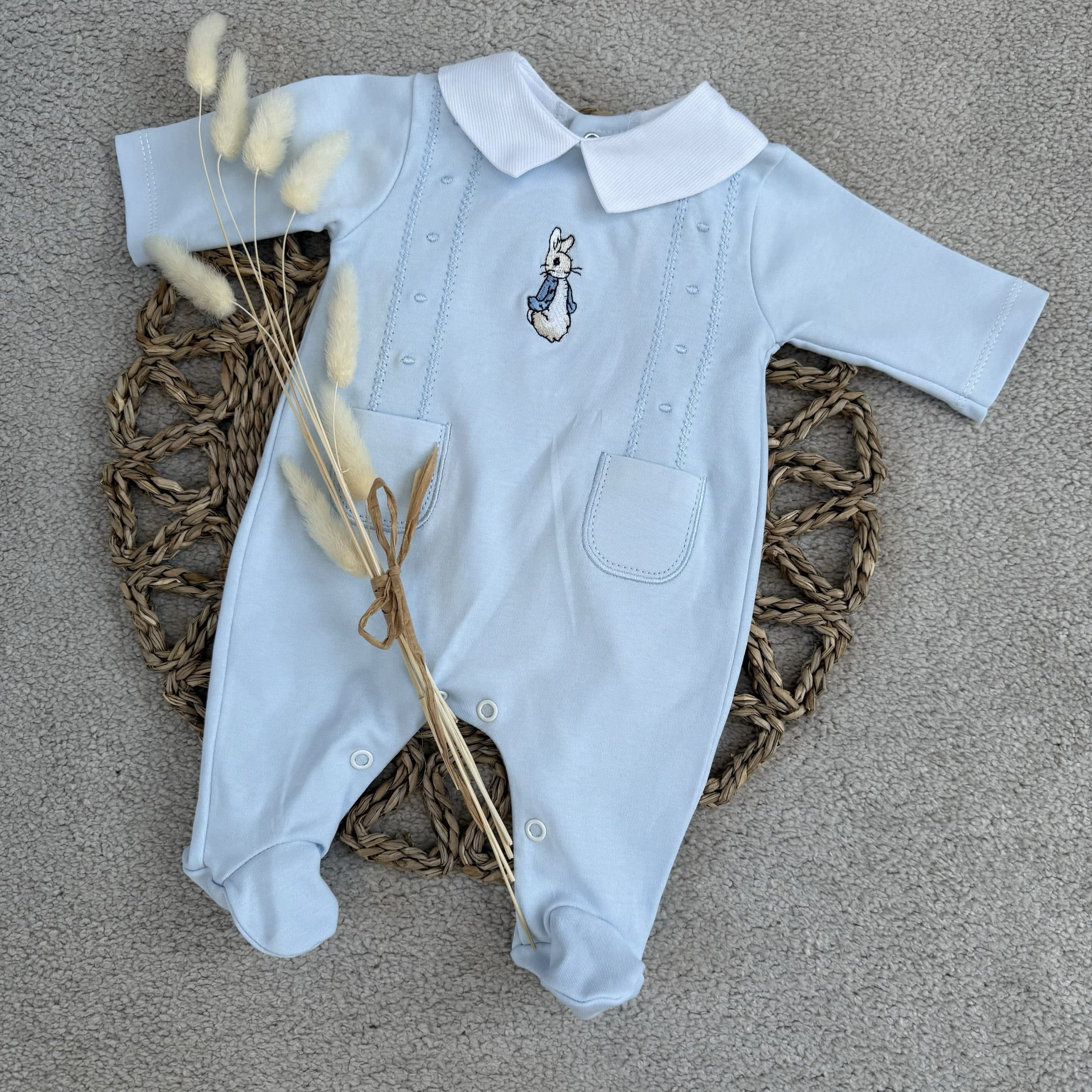 Baby boys beautiful cotton sleepsuit/baby grow in blue with peter rabbit on the front. button up at the back with full feet.