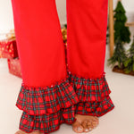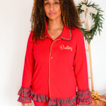 Step into Christmas in style with our Women’s Christmas Pyjamas, designed by Perfect Little Thing. Featuring a festive red button-up top trimmed with ruffles and matching trousers with layered frills at the hem, these PJs are both elegant and cosy — perfect for Christmas morning or festive family photos. Embroidery comes in gold!