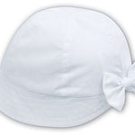 Baby girls White sun hat from Sarah Louise, made in a double layer of soft and lightweight polycotton. It has a pretty bow on the front, . It fastens under the chin with detachable fabric ties.