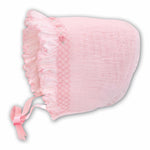 A traditional, hand-smocked pale pink bonnet for baby girls by Sarah Louise. Made and lined in soft polycotton, it has a silky ribbon to tie under the chin.