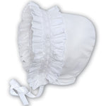 Baby girls traditional white bonnet by Sarah Louise. It is made in soft polycotton. with pretty ruffles and hand-smocked trim. The back is gently elasticated with detachable straps to tie under the chin.