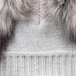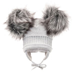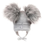 Adorable Grey hat for little Children by Sätila of Sweden. It is made in knitted acrylic with cotton lining and has two faux fur padded pompoms on the top.