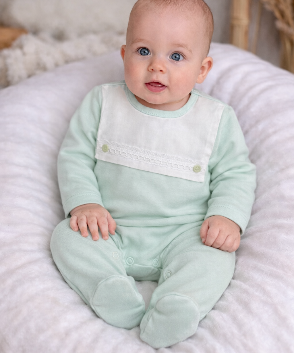 Baby Boys Mint Sleepsuit with Lace Bib
