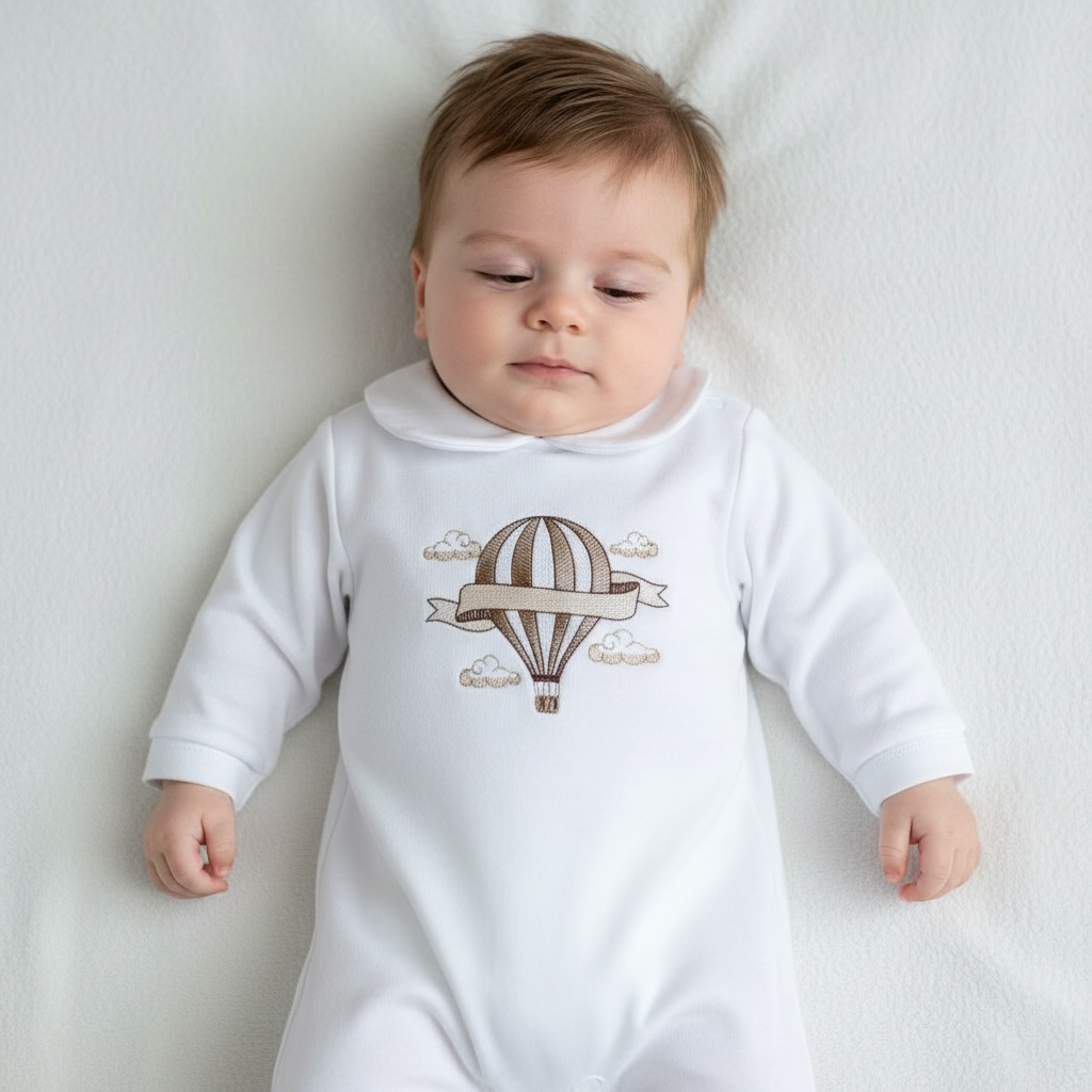 Dress your little one in timeless charm with our Baby White Sleepsuit with Matching Bib. Made from 100% soft cotton, this elegant sleepsuit features a classic Peter Pan collar and a beautifully embroidered hot air balloon motif on the front. The set includes a handmade matching bib, finished with a delicate beige edge thread for the perfect touch of detail.