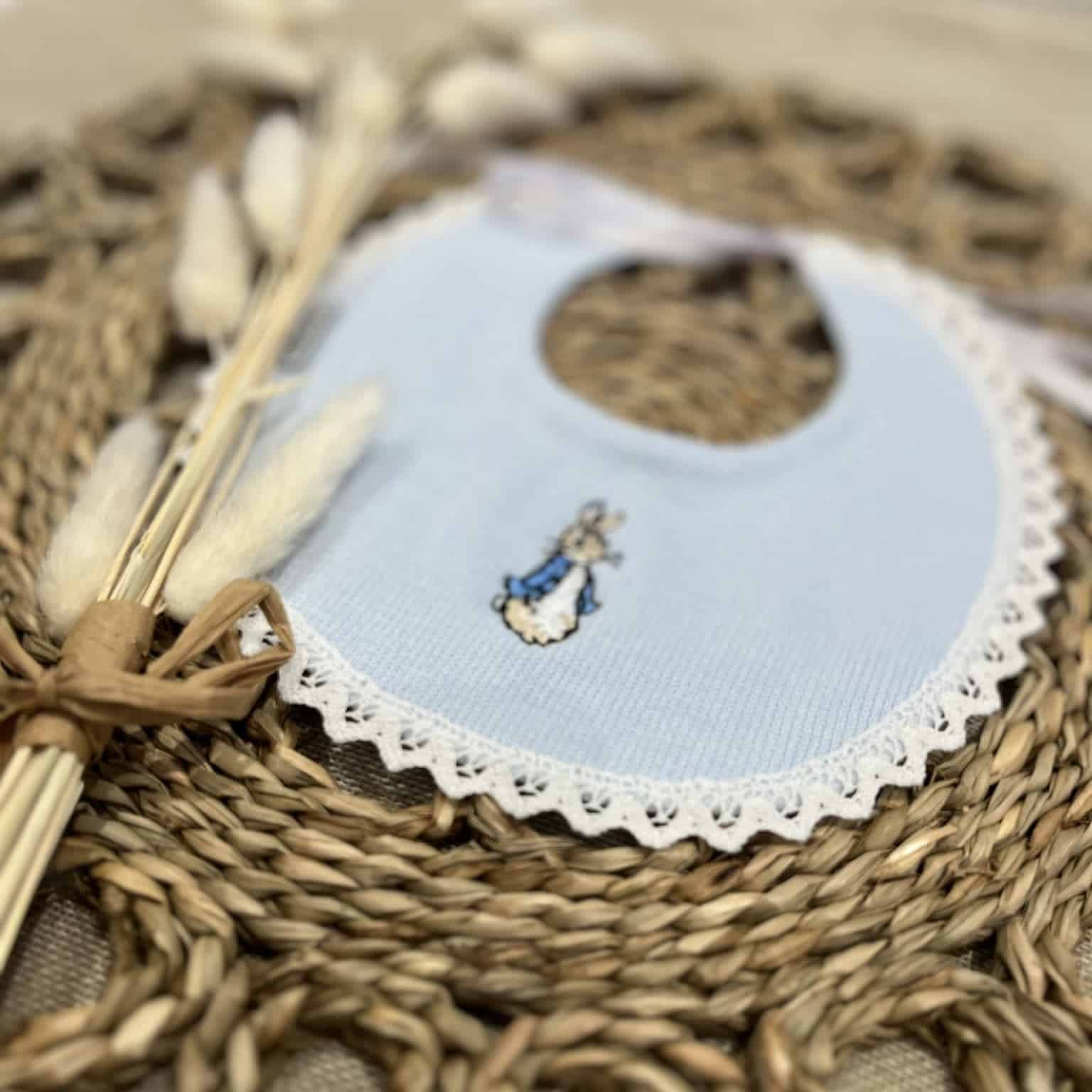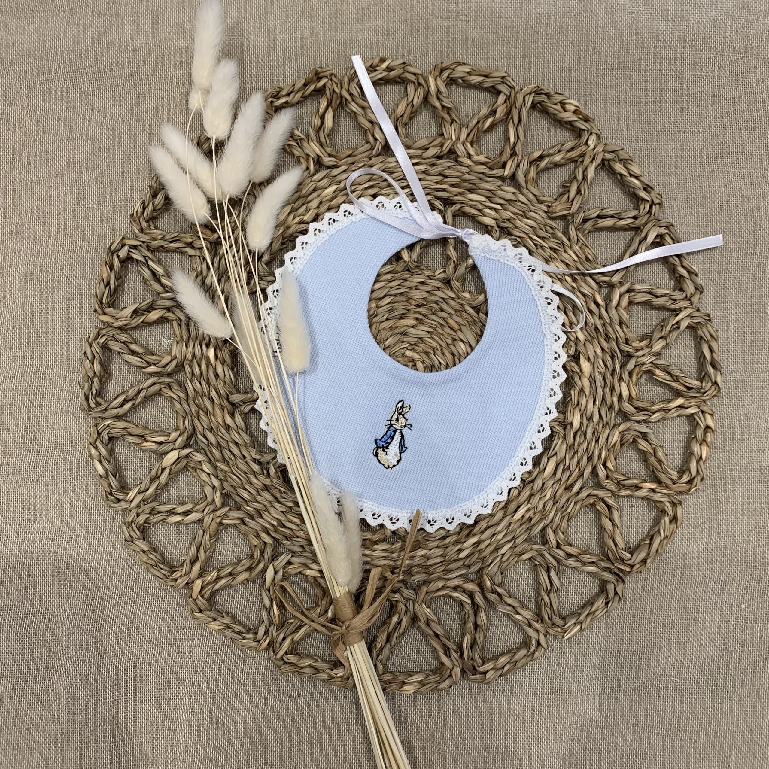 Beautiful boys peter rabbit embroidered cotton bib, bib is a babidu bib.