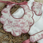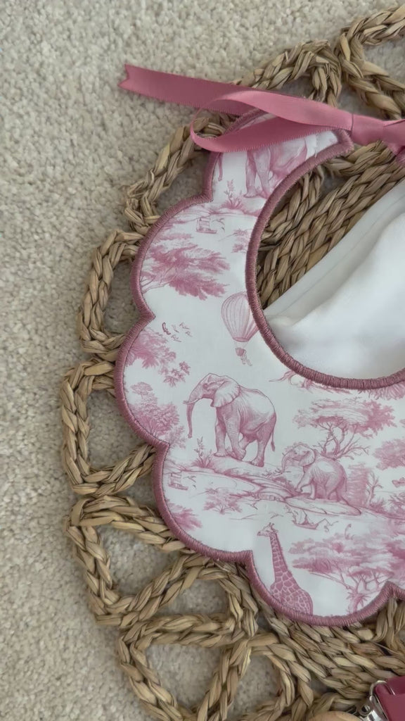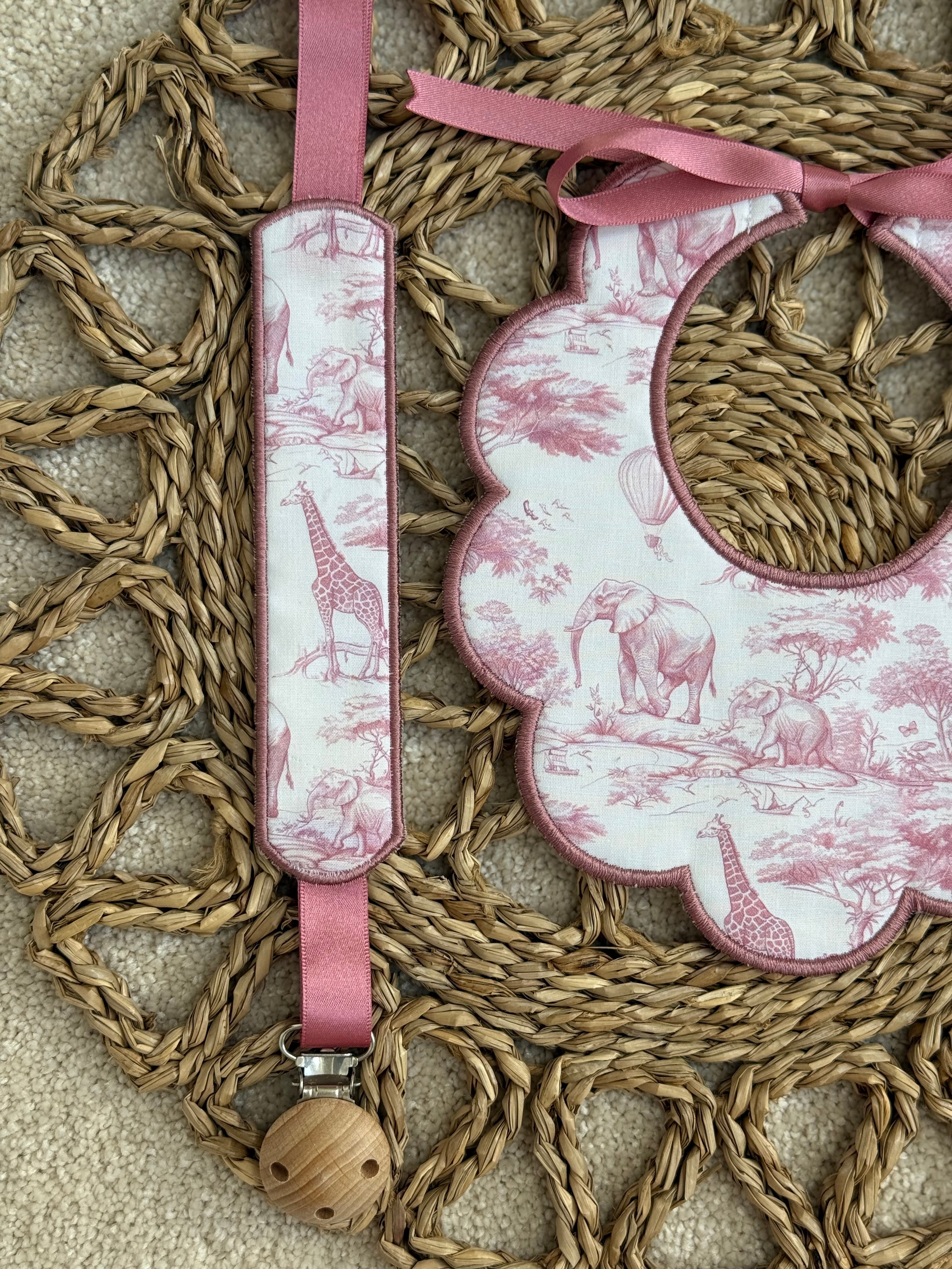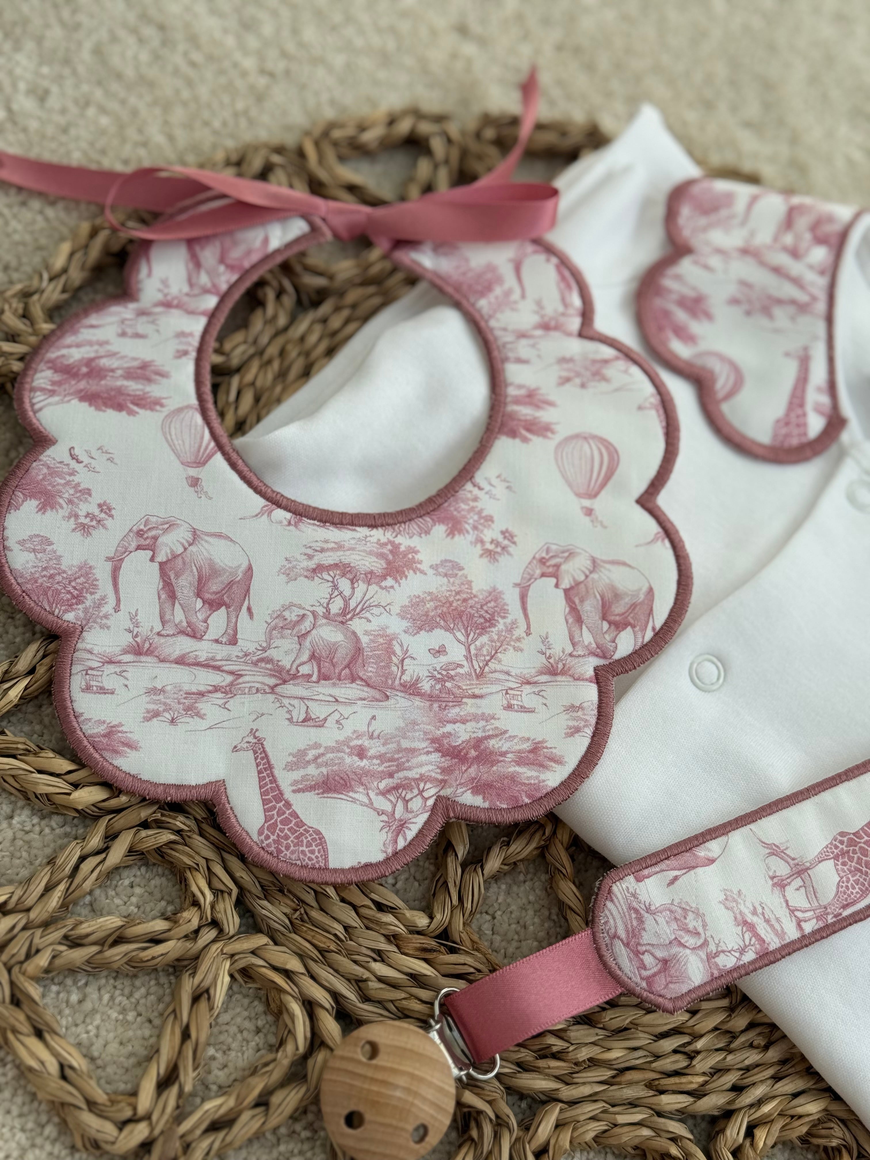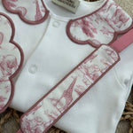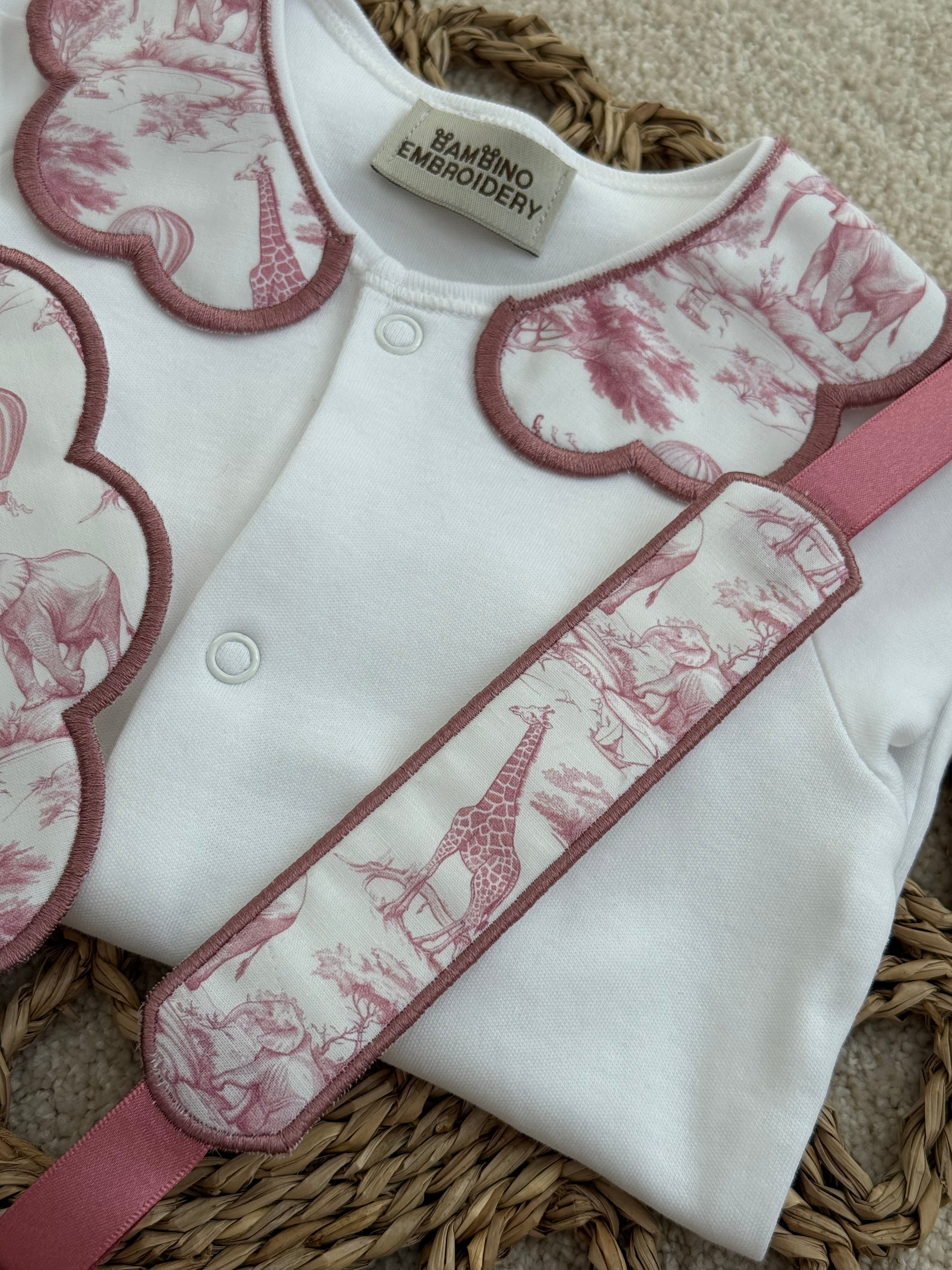 Girls Dusky Pink Safari Print Handmade Sleepsuit, Dummy Clip & Bib Set