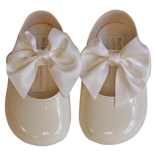Ivory pre-walker occasion shoes for baby girls from British brand Early Days, made in soft patent faux leather. They have a comfortable textile lining and a lightly cushioned insole, with a soft, flexible outer sole. For a pretty finish, they have a Ivory big satin bow on the button fastening strap.