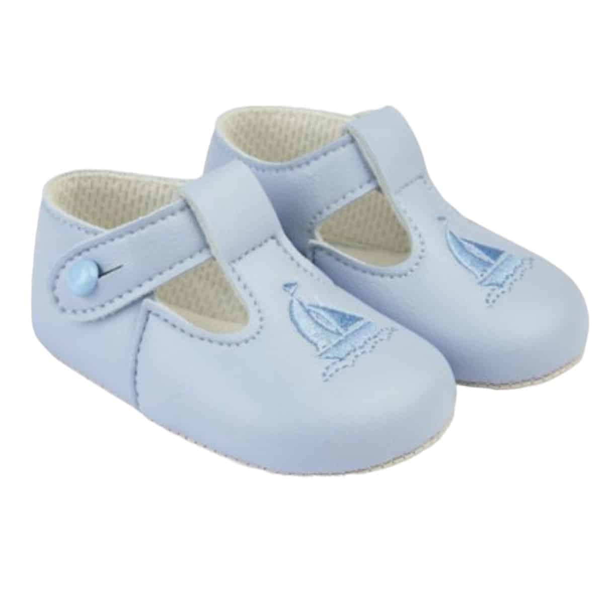 White and beige traditional pre-walker shoes for little boys by Early Days Baypods, made in soft faux leather. They have a flexible sole and a comfortable lightly padded insole, embroidered with a sweet sailboat on the front.