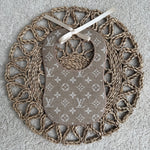 Add a touch of playful luxury to mealtime with this beautifully crafted leather bib and matching dummy clip. Featuring a charming Mickey and Minnie print on a classic brown designer-inspired pattern, this set blends style with practicality.