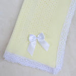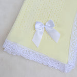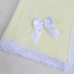 Baby's beautiful knitted Spanish shawl with lace trim and a lace bow, Perfect for a gift for a baby shower, birth or birthday! This luxury shawl is made from acrylic.