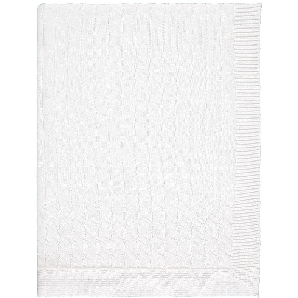 An absolute essential for newborn baby, is this White knitted baby blanket. The blanket measures 75cm x 75cm and is in a cable knit and ribbed edge design. This beautiful blanket make a simple but perfect baby gift.