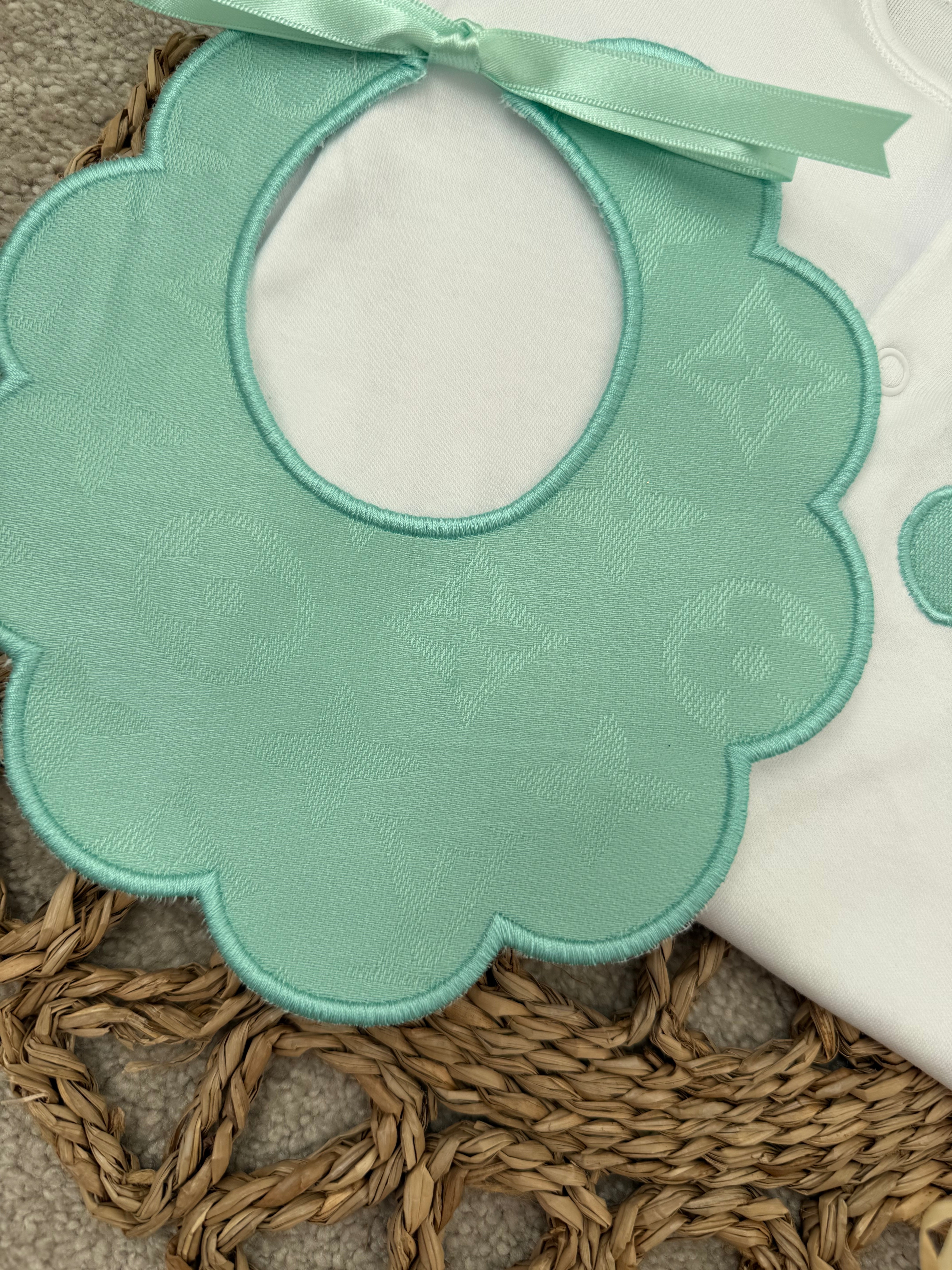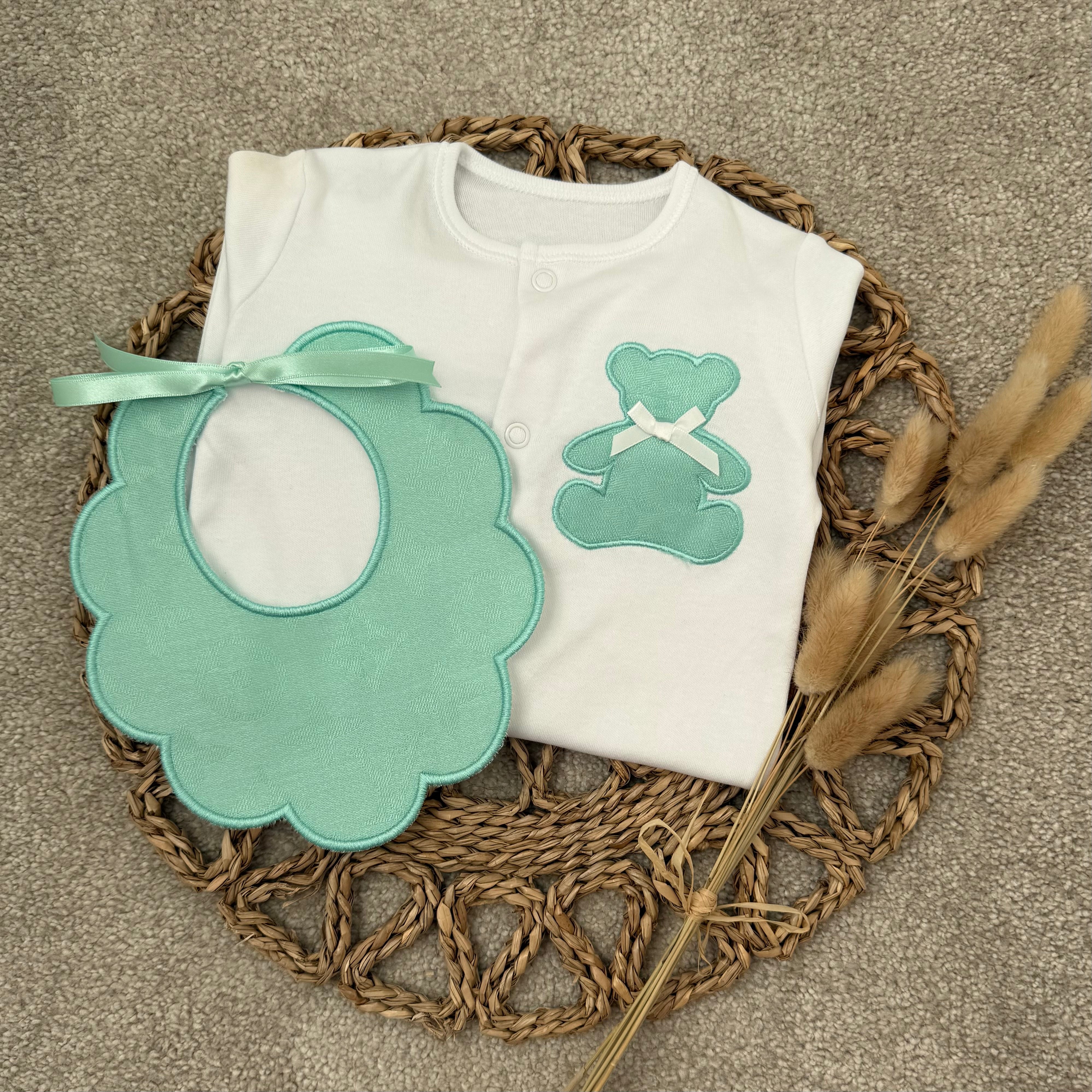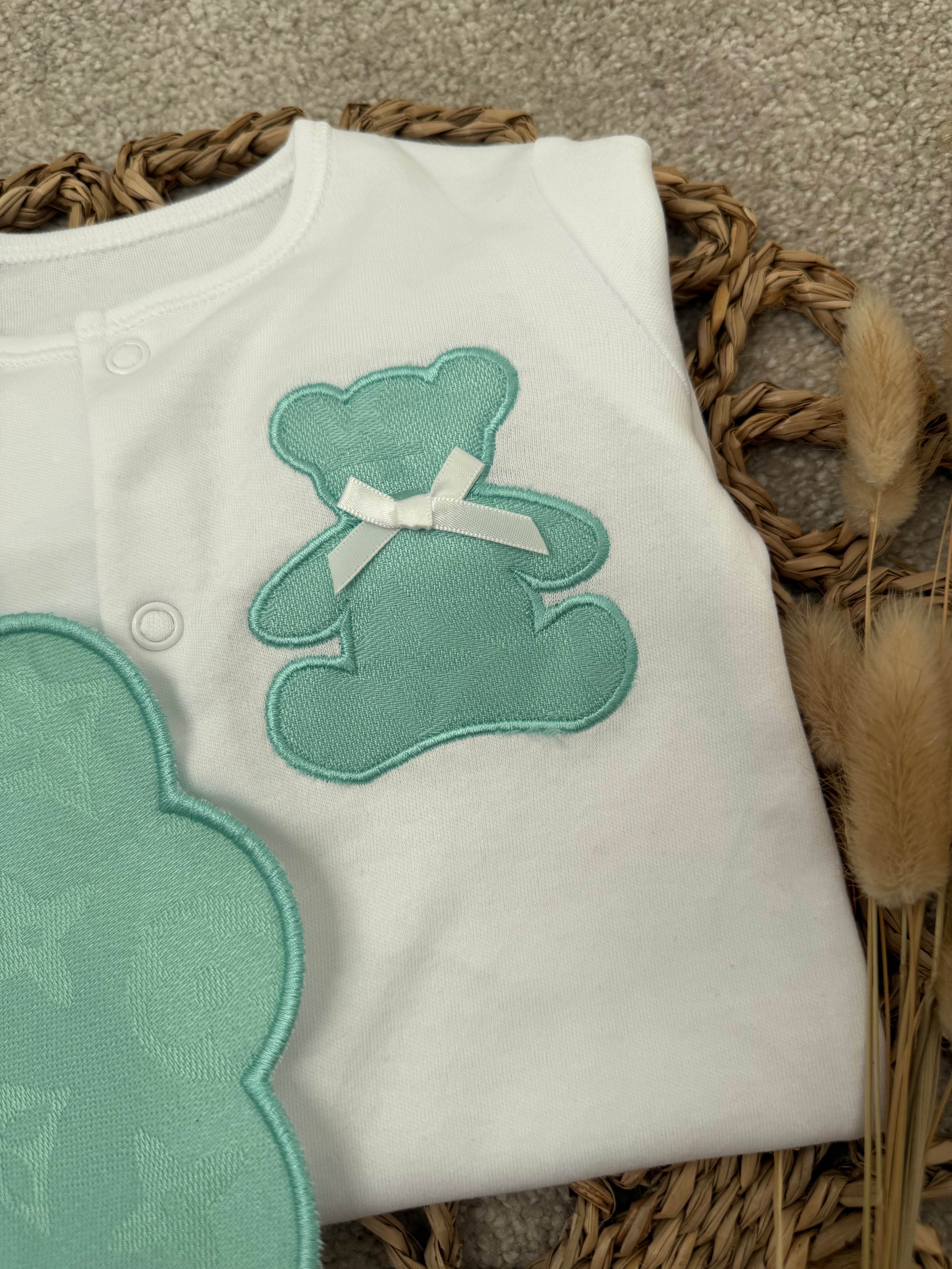 Girls Mint Billy Bear Handmade Sleepsuit & Bib Set