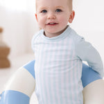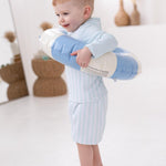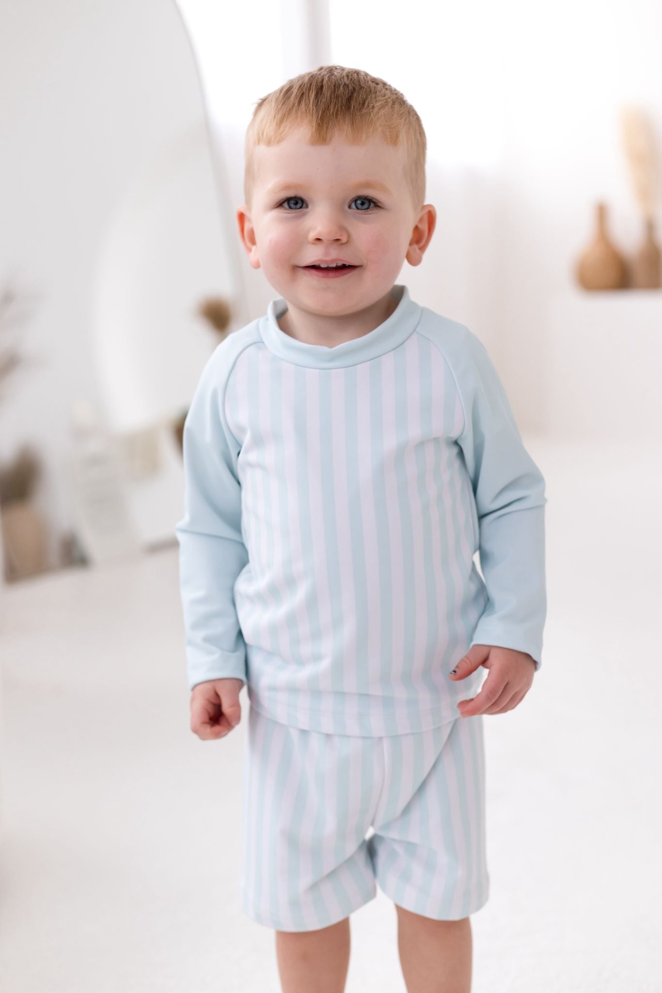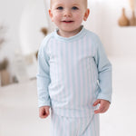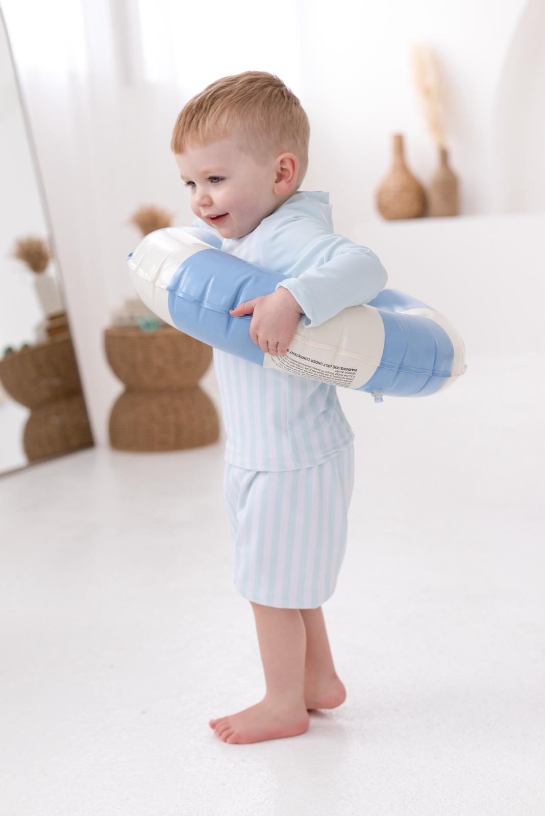 Our Boys green Stripe Swim Set is the definition of timeless summer style. Designed in a soft baby green and white vertical stripe, this two-piece set includes a long sleeve rash vest and matching swim shorts – perfect for stylish little boys who love the water.