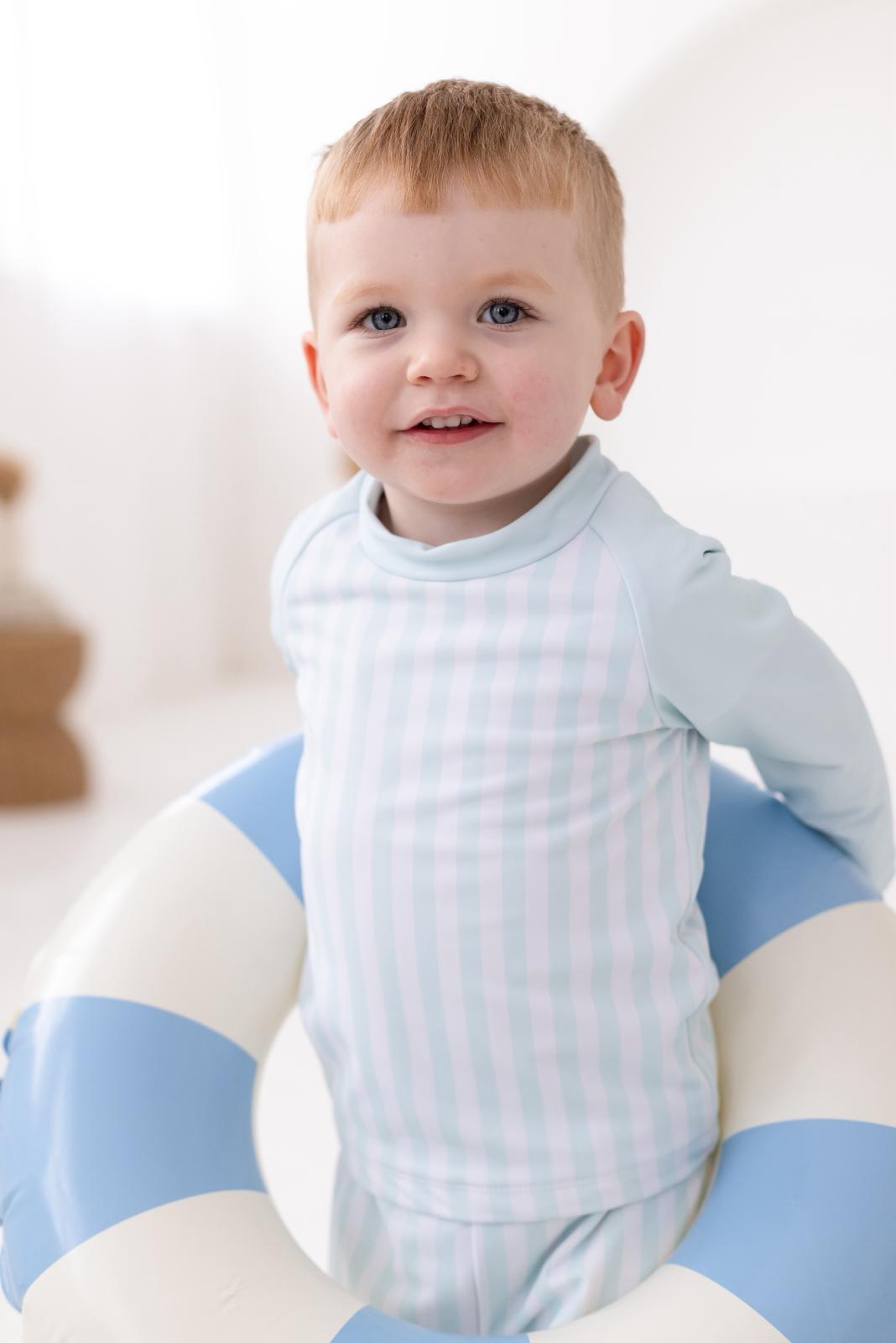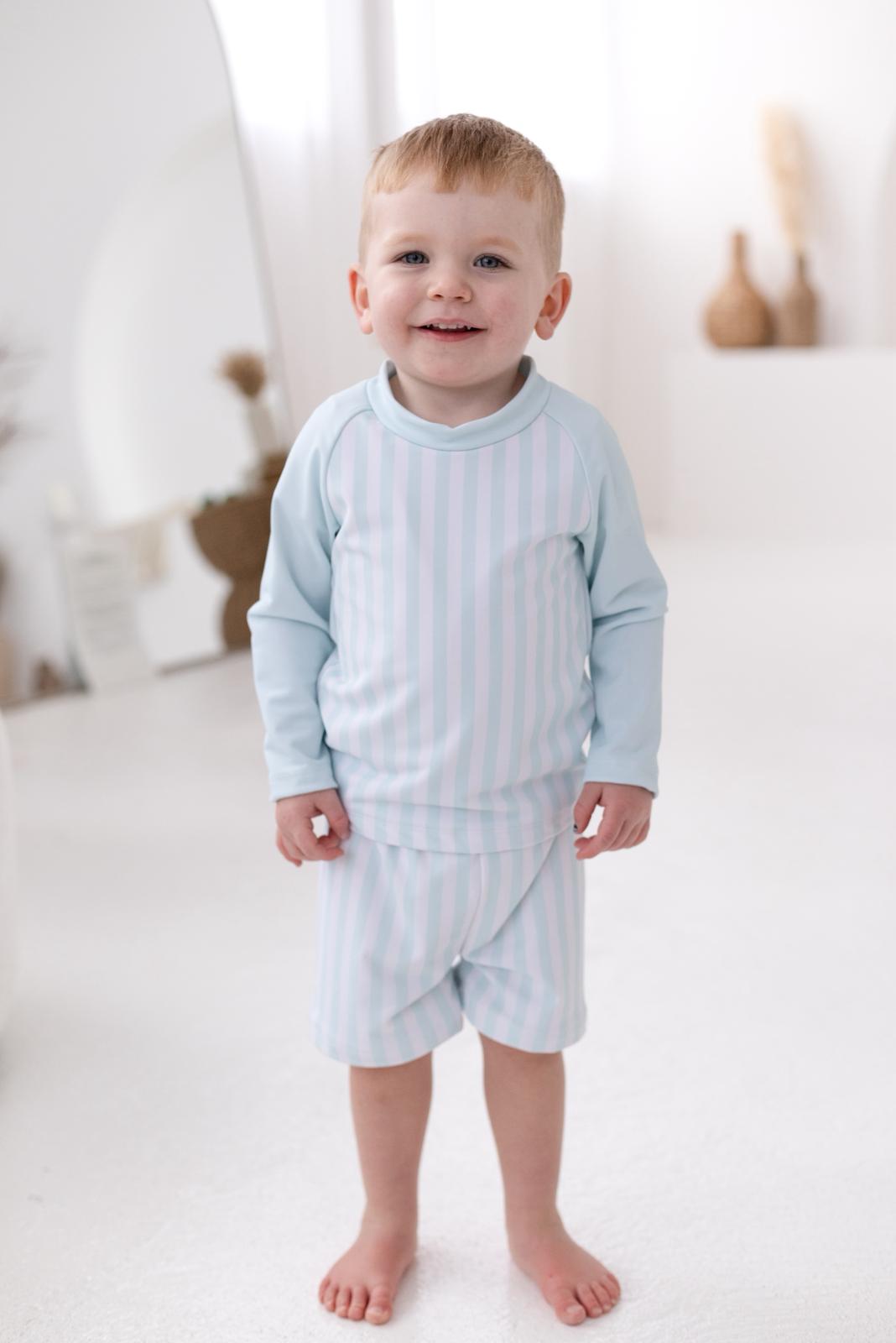 boys swim set, boys long sleeve swimwear, green stripe boys swimwear, traditional boys swim set UK, boys rash vest and shorts, classic boys beach outfit, luxury boys swimwear UK, pastel green boys swimwear, holiday swimwear for boys, seaside boys outfit