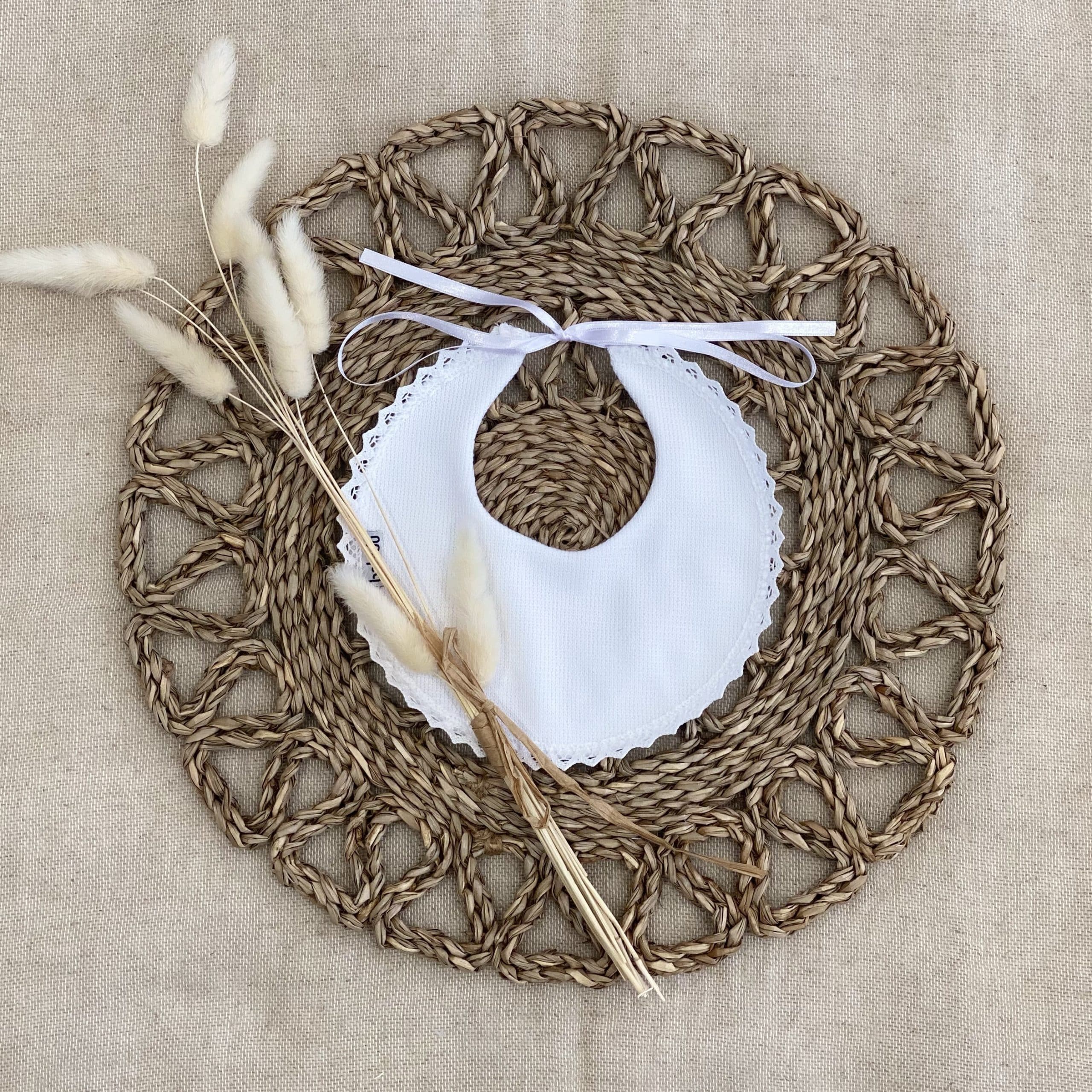 Unisex white woven cotton baby bib from Babidu. With delicate white lace embroidery around the edges, this sweet bib fastens around the neck with a satin ribbon and the reverse side is made in soft cotton jersey.