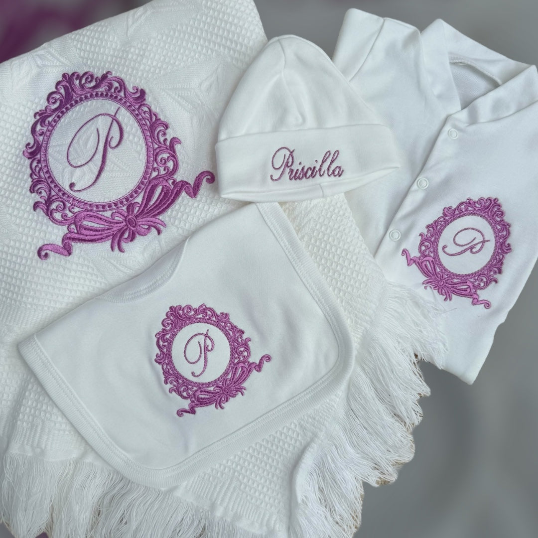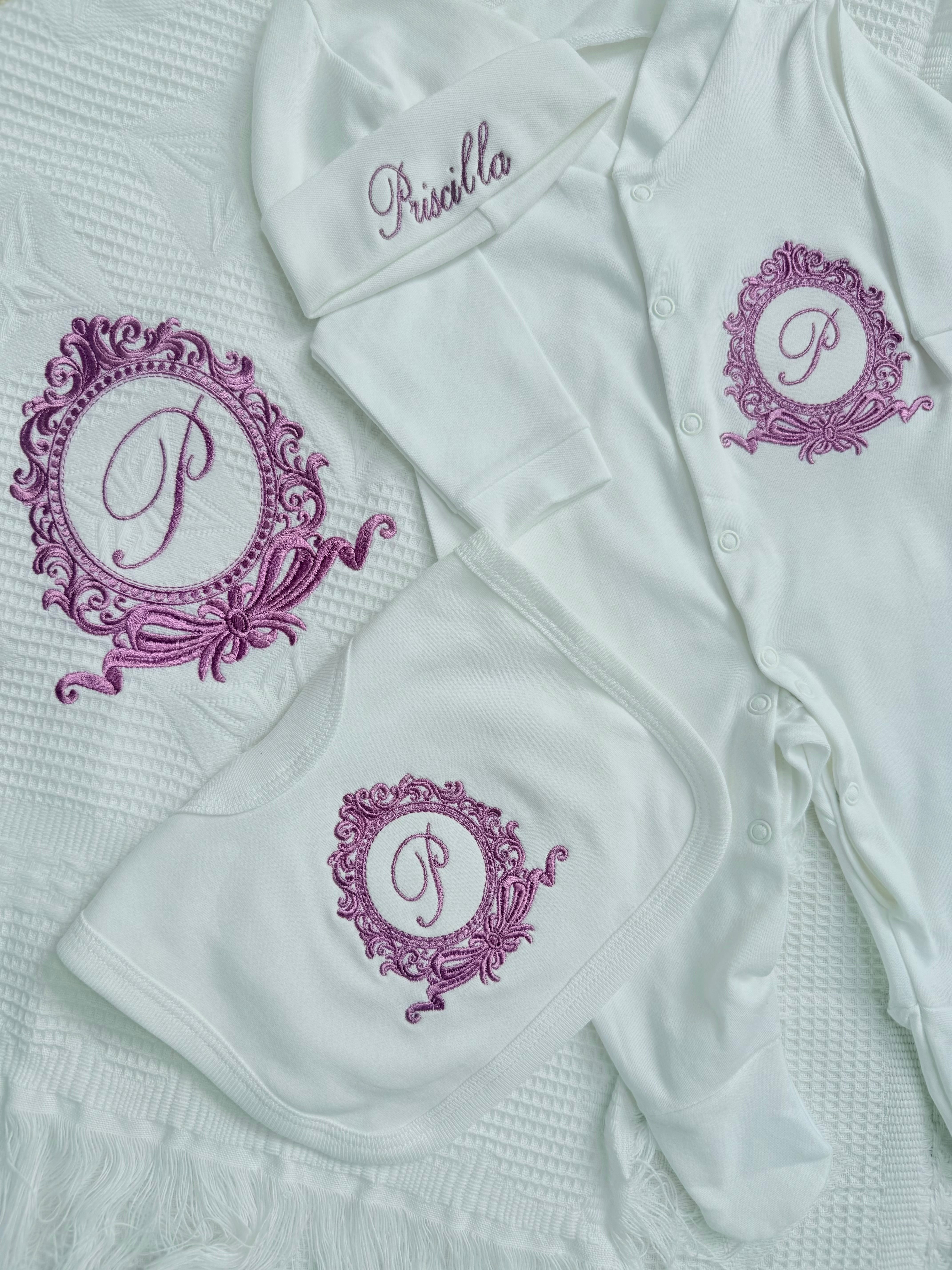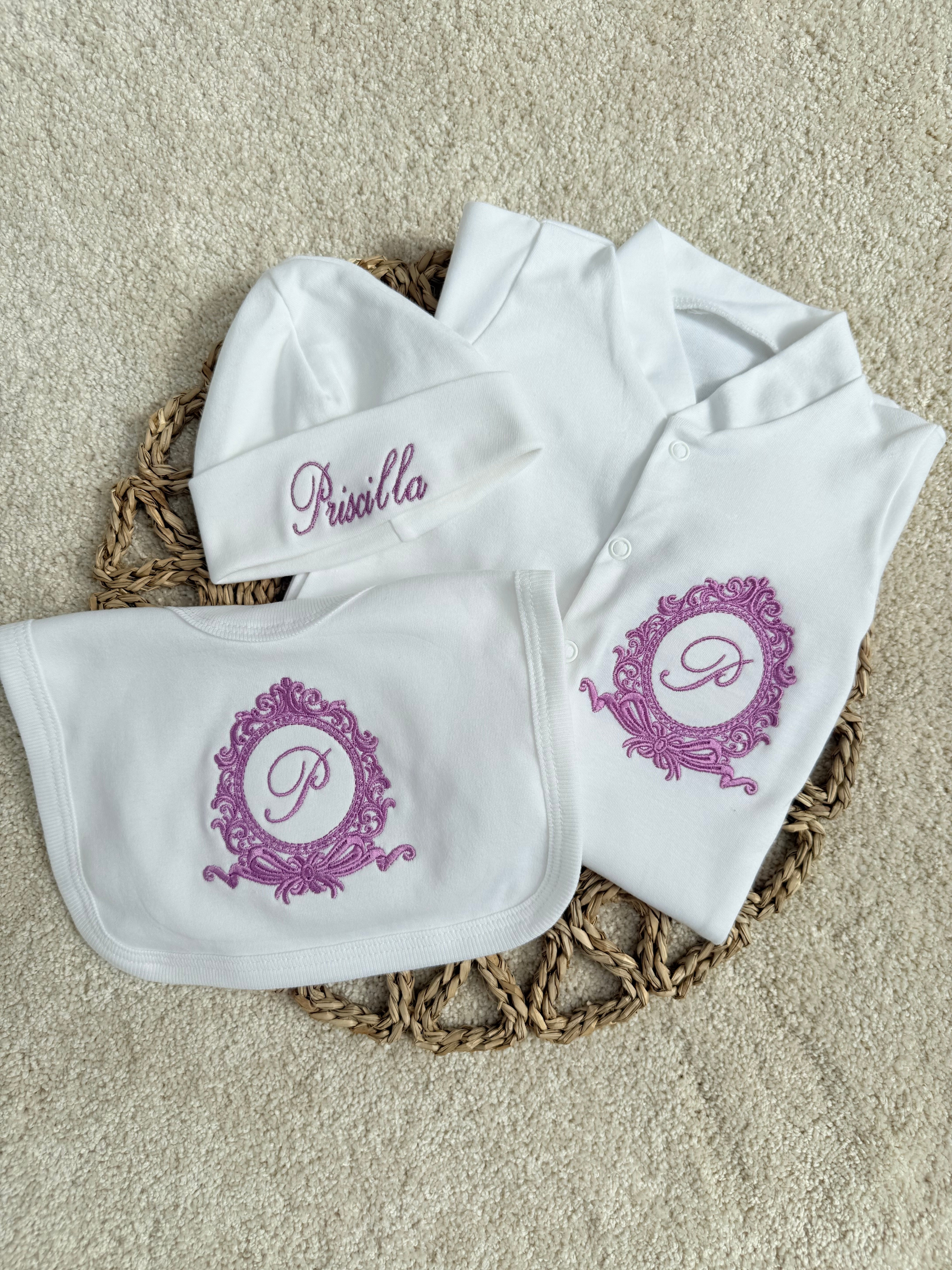 Introducing our exquisite personalised coming home outfit set, thoughtfully designed for both baby girls and boys. Crafted from soft, breathable cotton, this set ensures your newborn's comfort on their first journey home. Each piece features a crest adorned with your baby's initial, adding a touch of elegance to this memorable occasion.