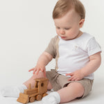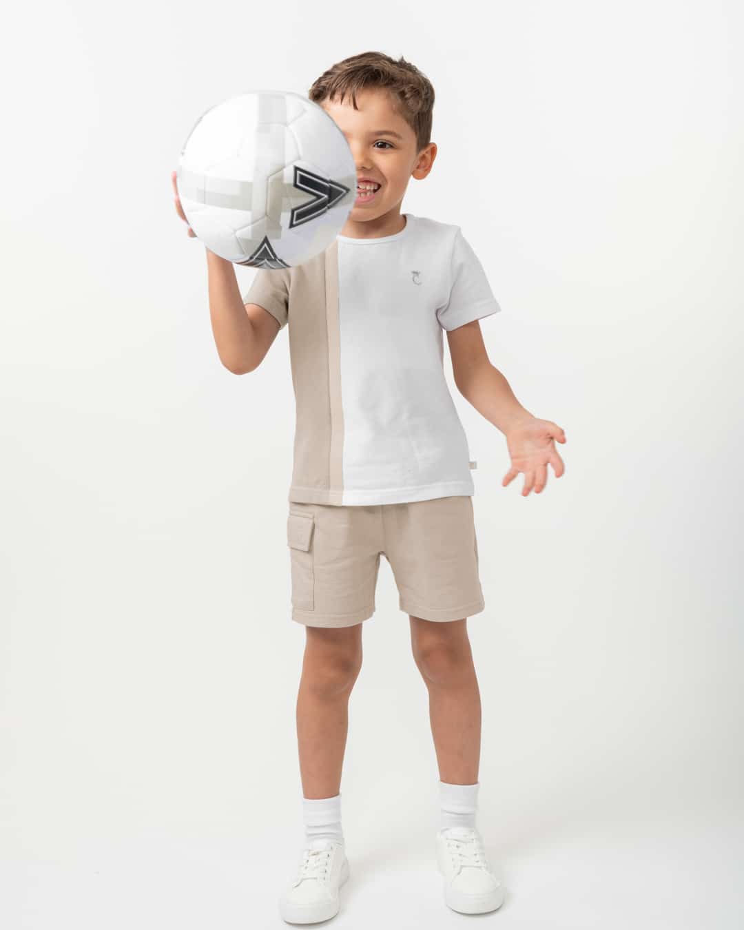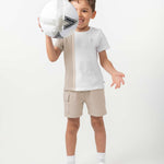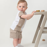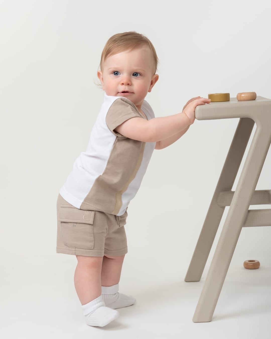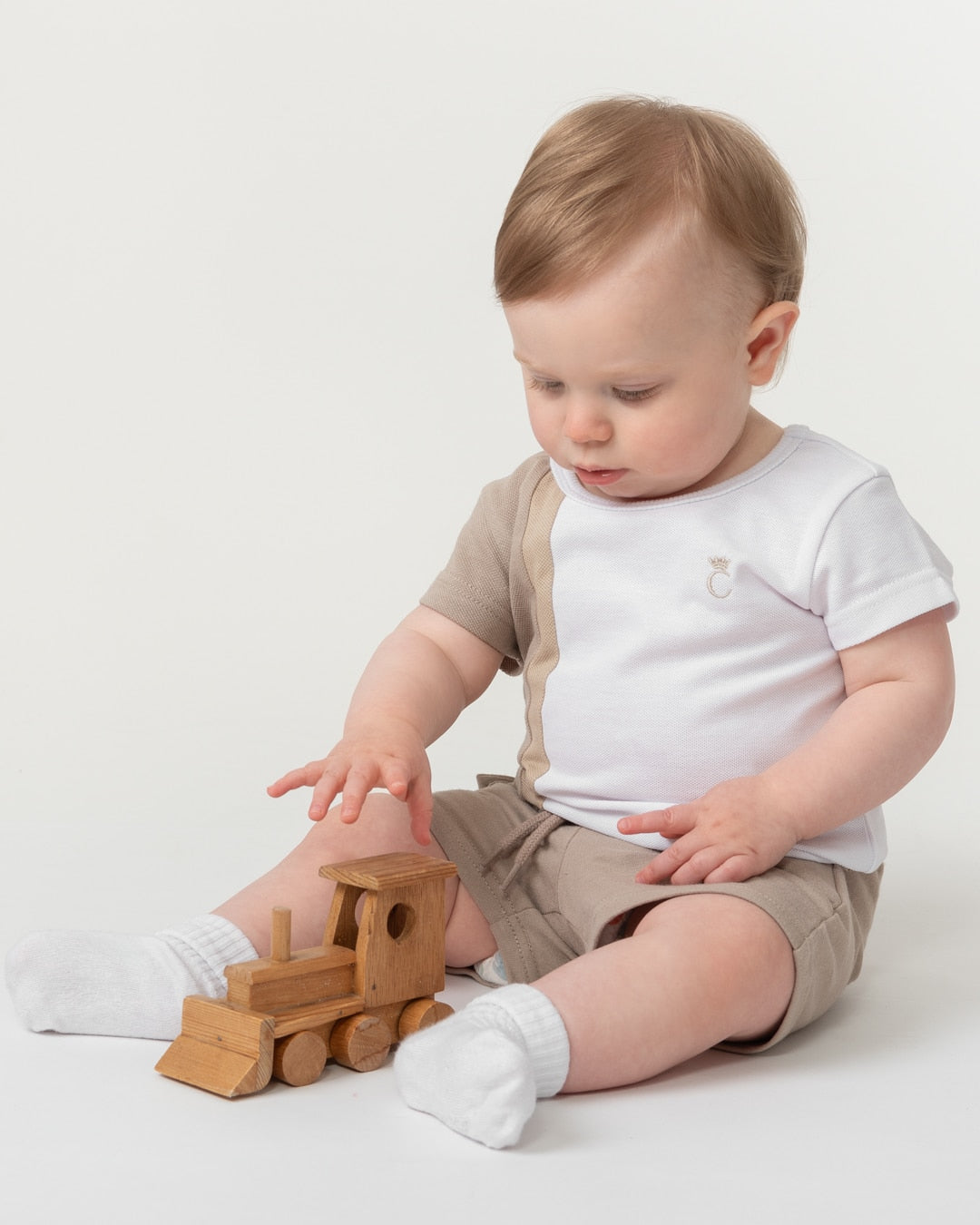 White and beige cotton shorts set for boys by Caramelo Kids. Made in soft piqué, the T-shirt has a lightly ribbed neckline and a beige logo embroidered on the chest. Completing the casual look, the comfortable jersey shorts have useful pockets and a drawstring waistband for an ideal fit.