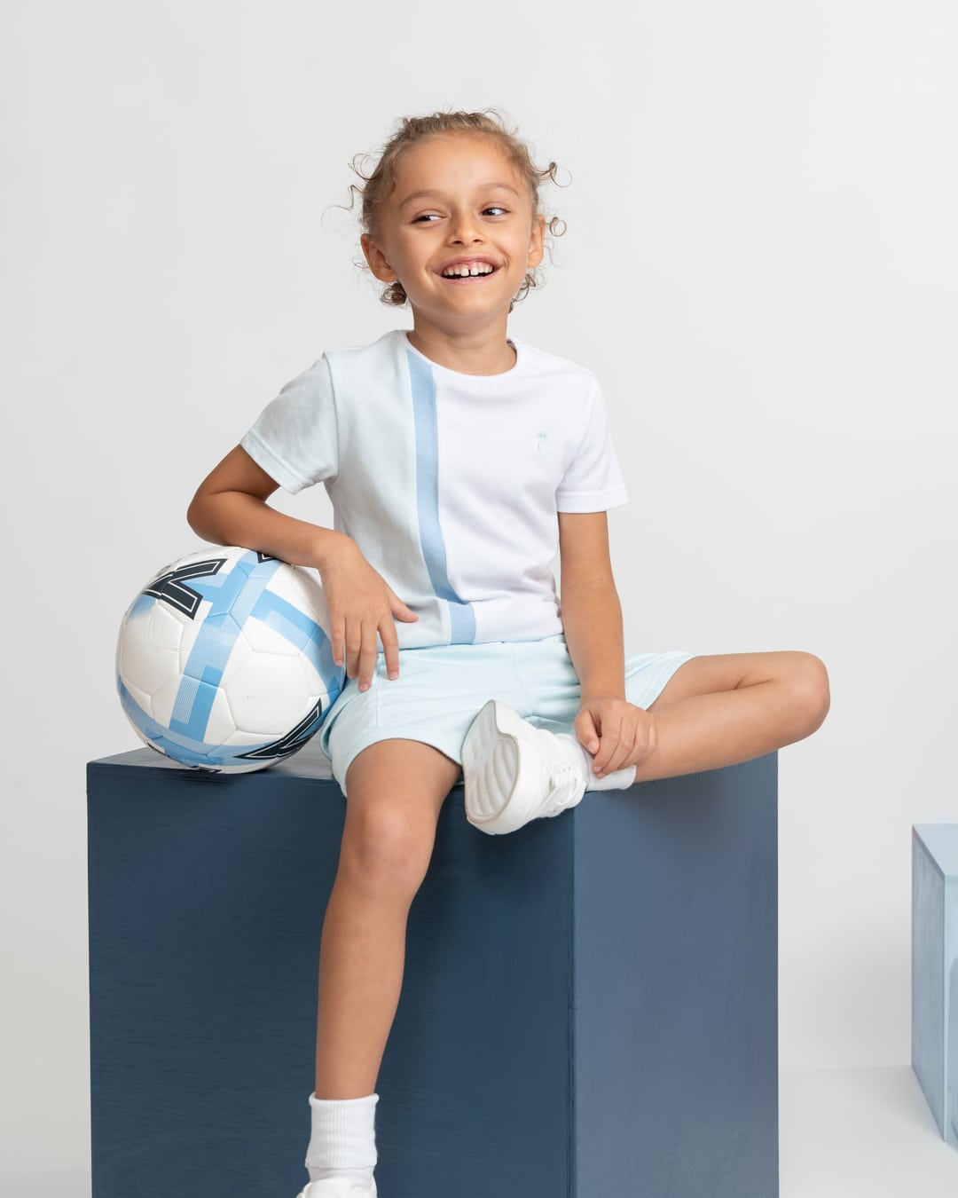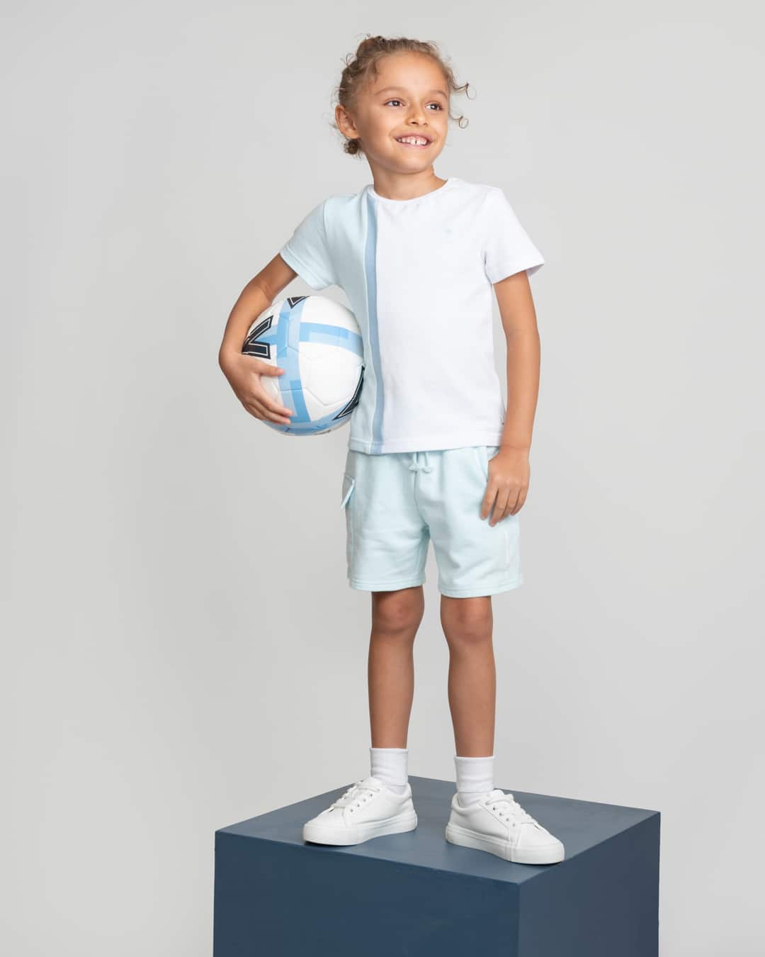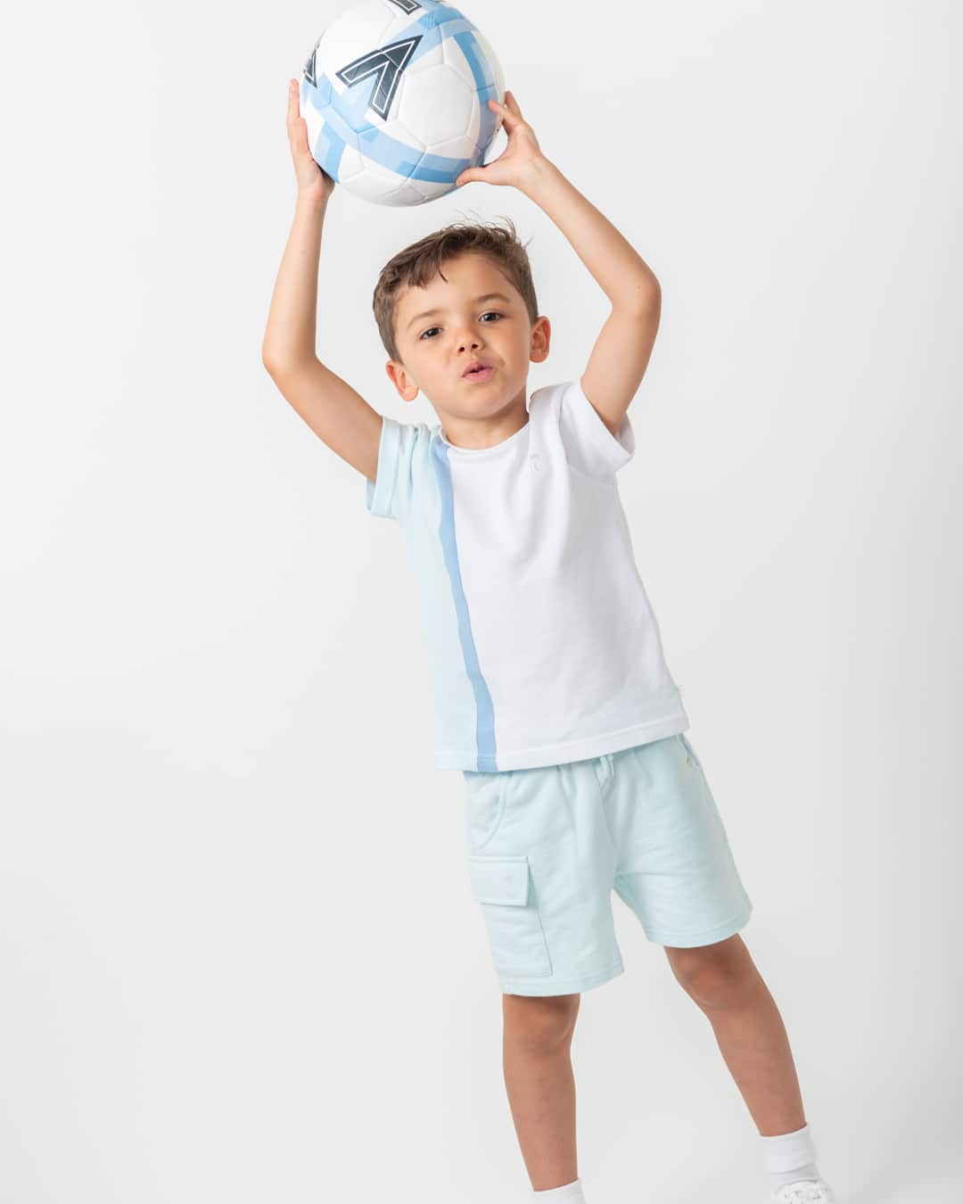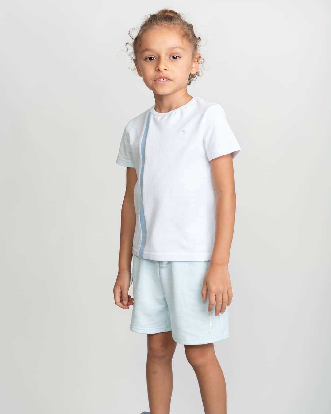 White and beige cotton shorts set for boys by Caramelo Kids. Made in soft piqué, the T-shirt has a lightly ribbed neckline and a beige logo embroidered on the chest. Completing the casual look, the comfortable jersey shorts have useful pockets and a drawstring waistband for an ideal fit.