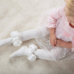 Girls white tights by Caramelo Kids, made in a soft and stretchy cotton blend with a ruffled satin ribbon around the ankle.
