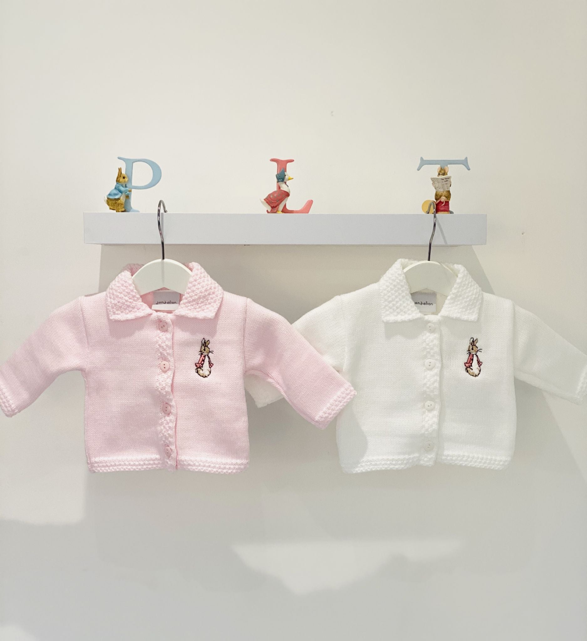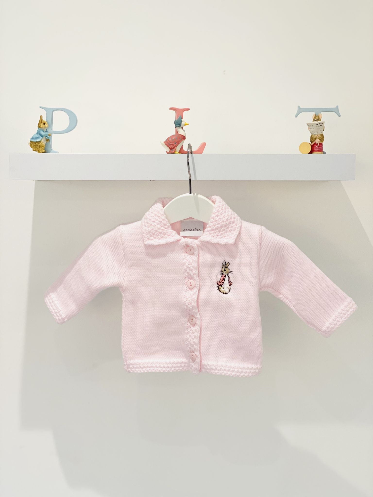 Beautiful quality traditional boys knitted cardigan from Dandelion Knitwear with Peter Rabbit embroidery to chest.