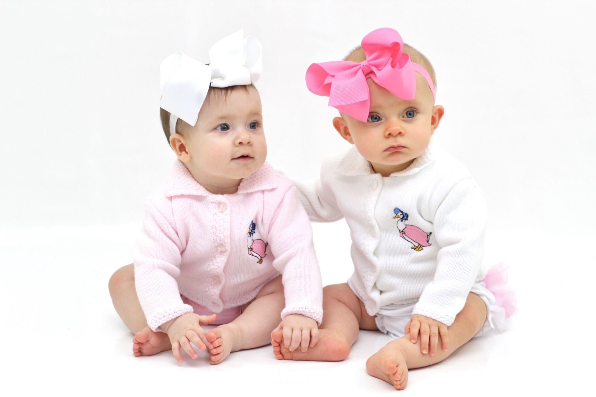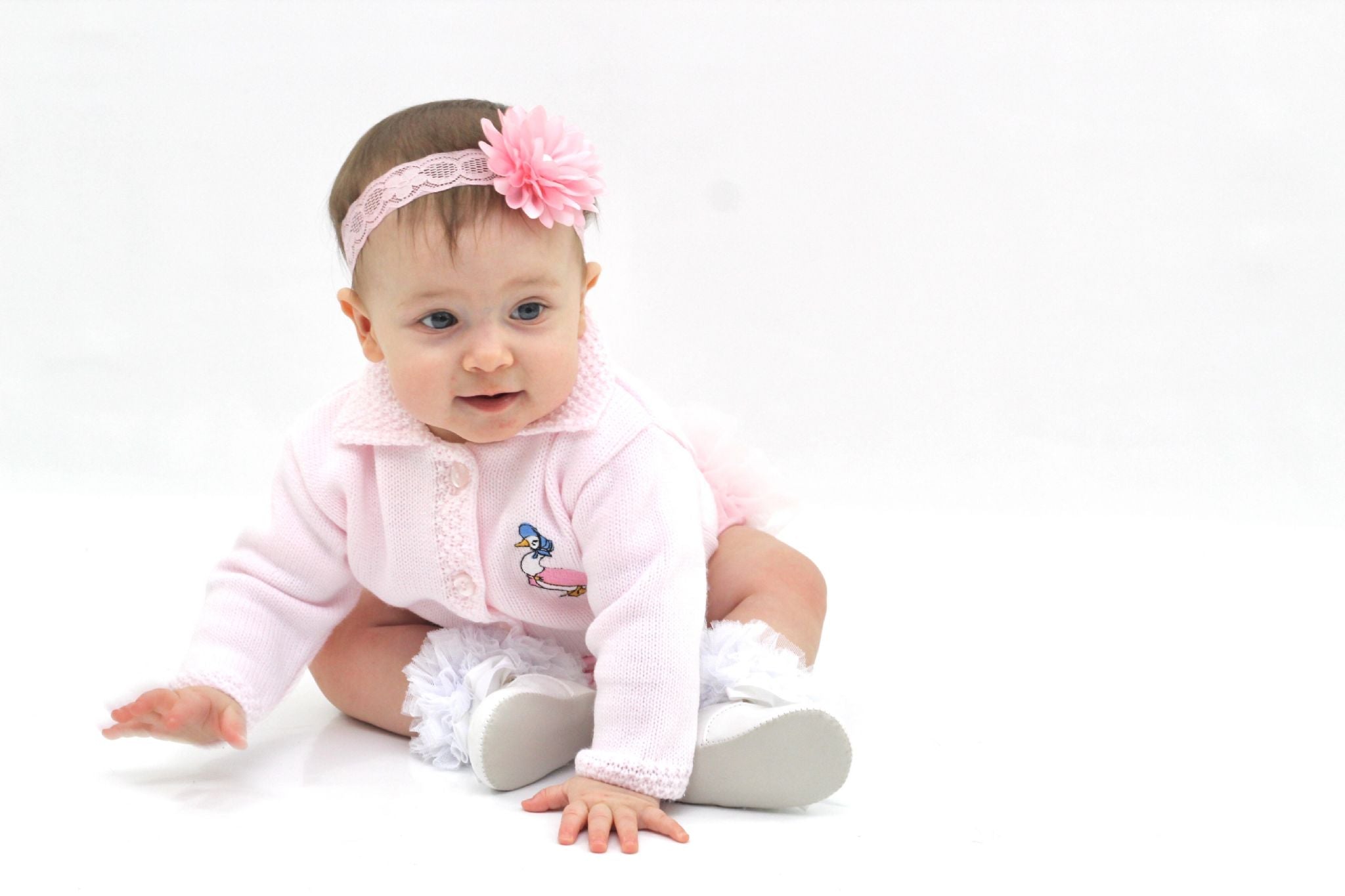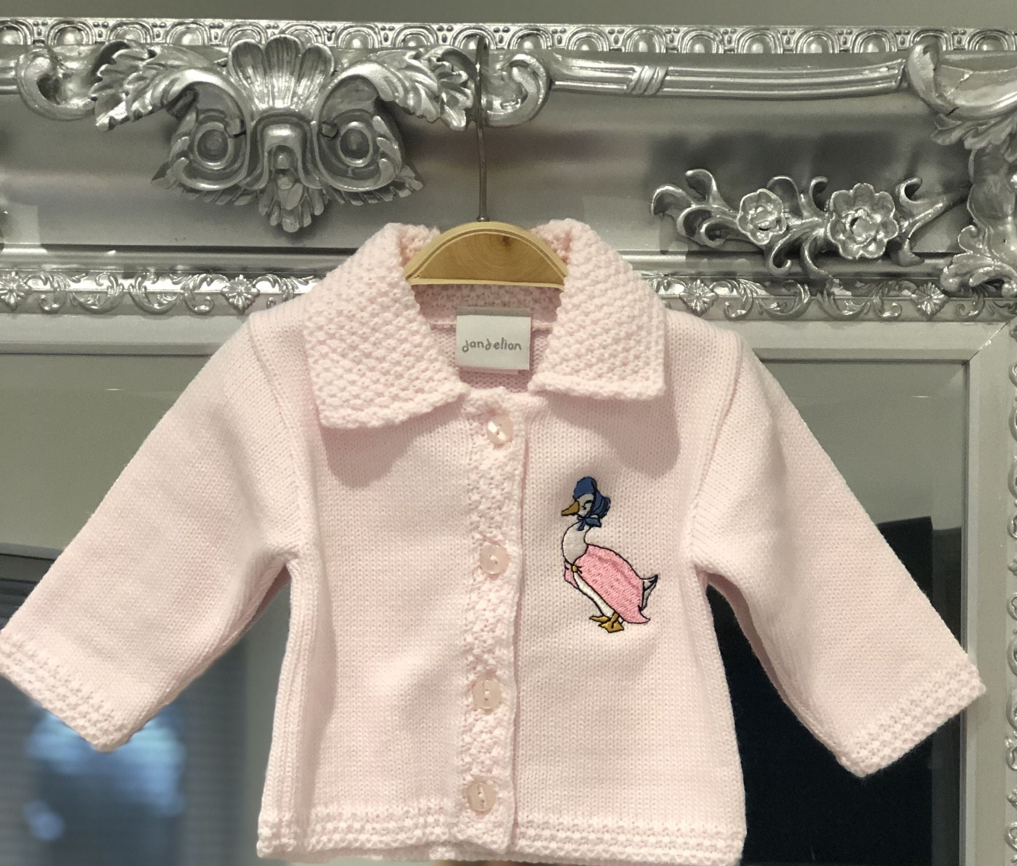 Beautiful quality traditional girls knitted cardigan from Dandelion Knitwear with Jemima Puddle Duck embroidery to chest.