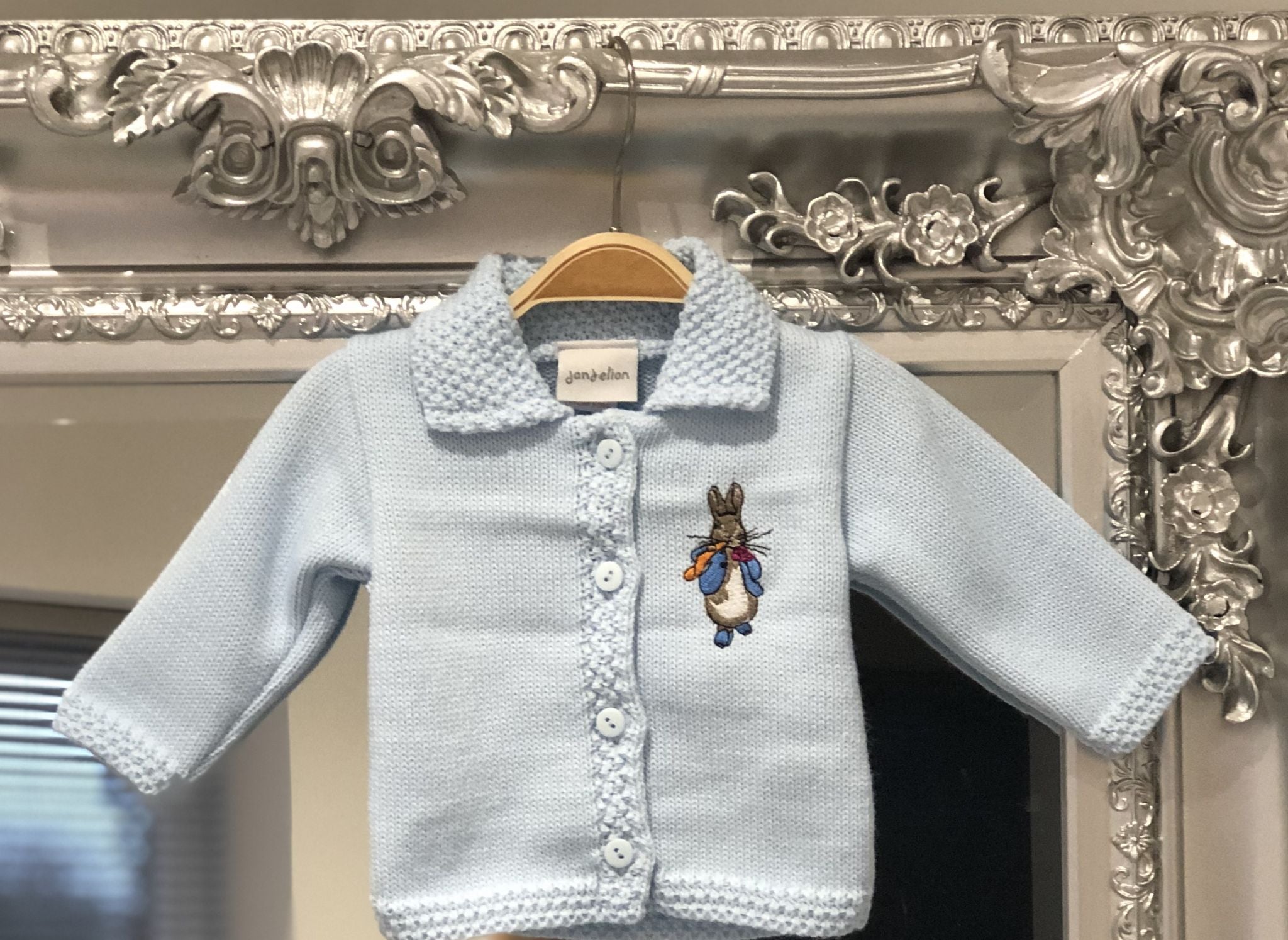 Beautiful quality traditional boys knitted cardigan from Dandelion Knitwear with Peter Rabbit embroidery to chest.