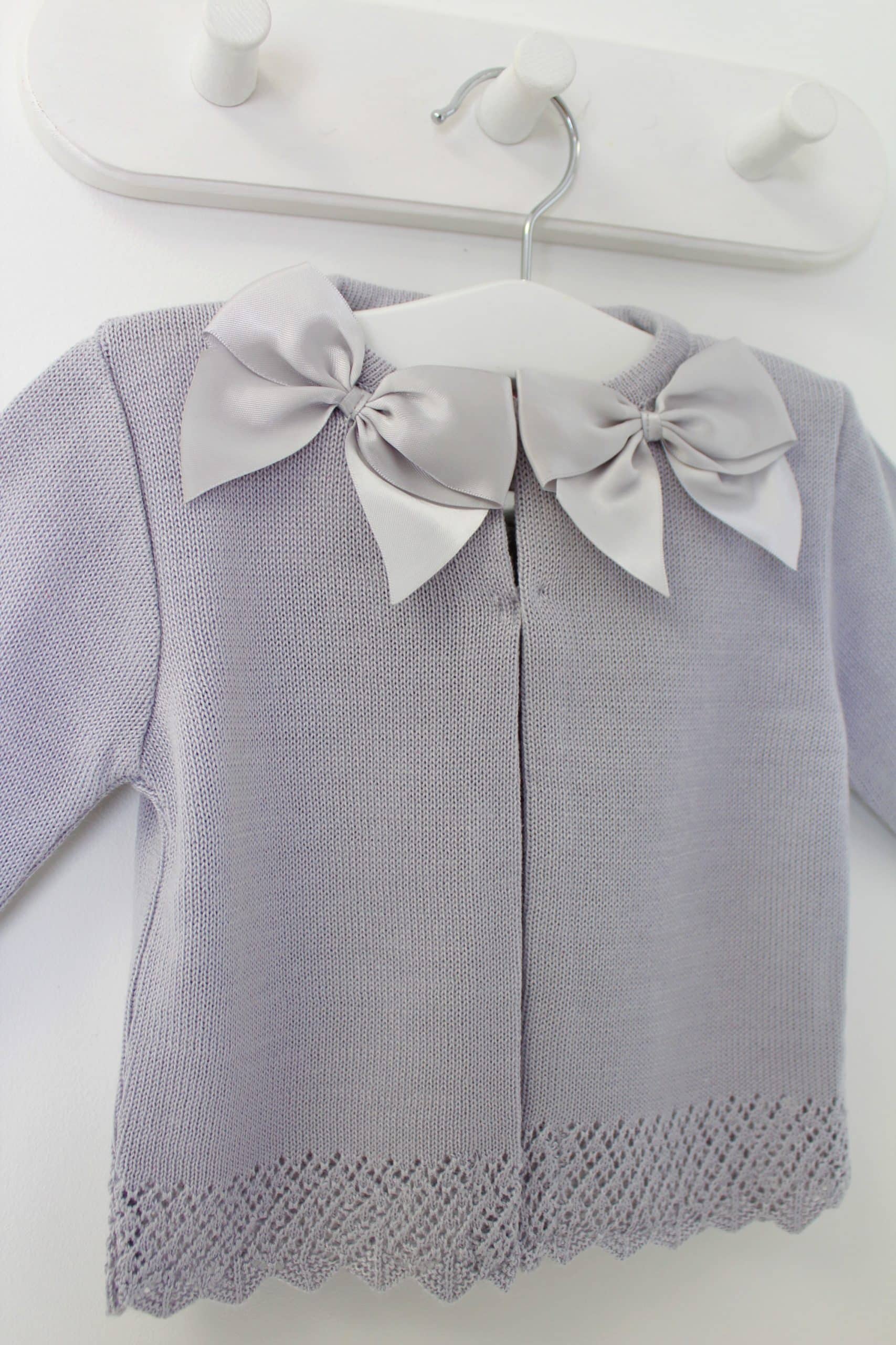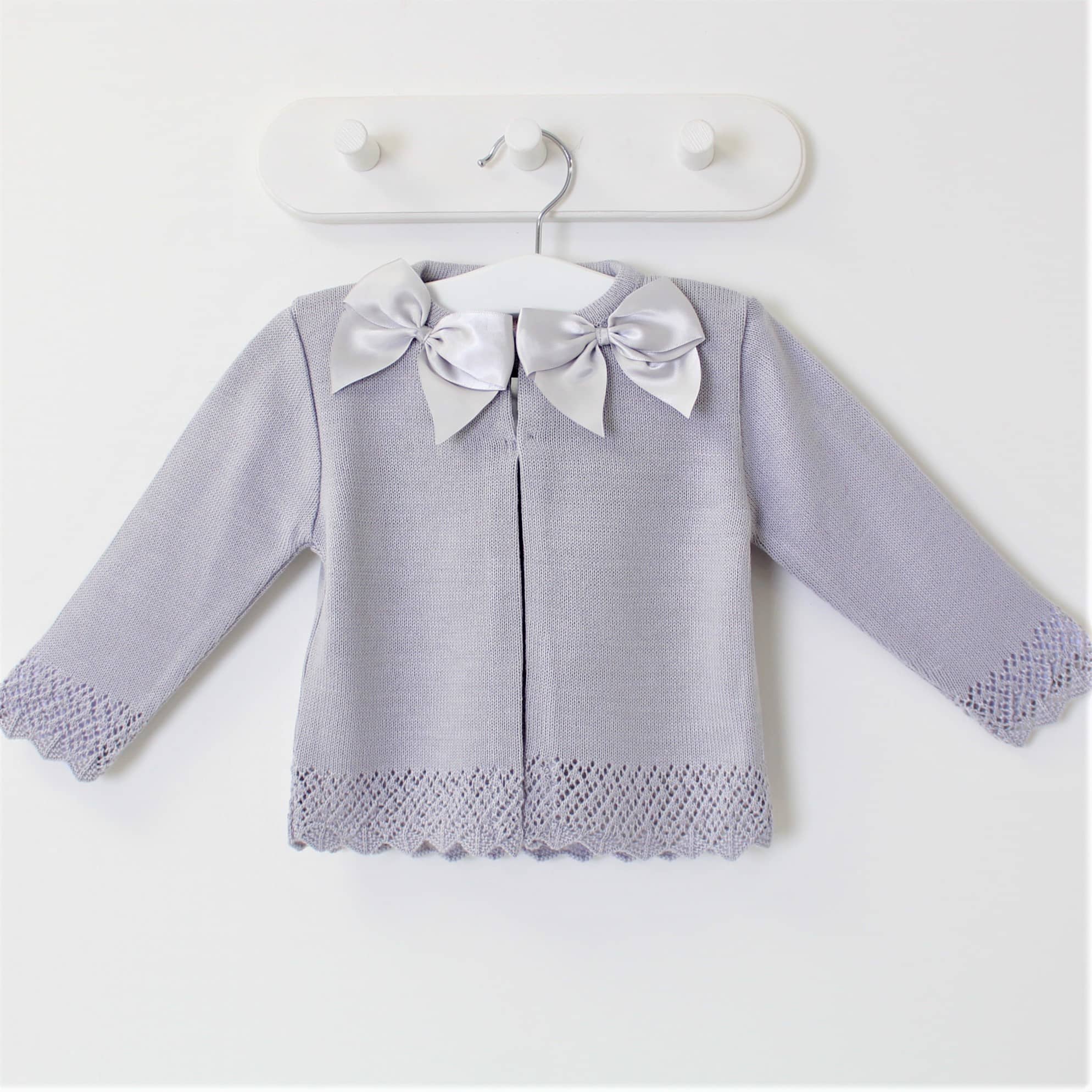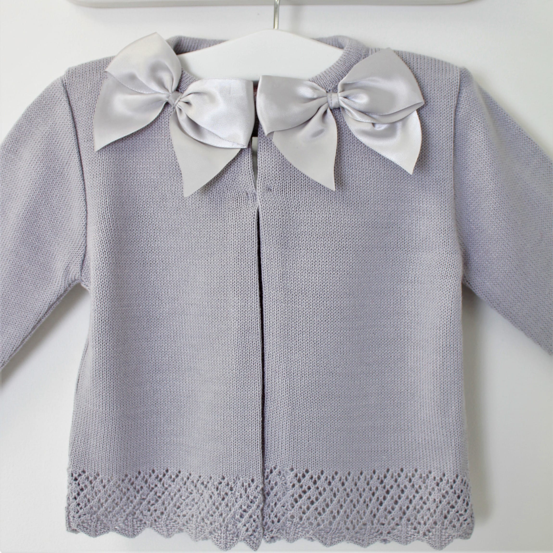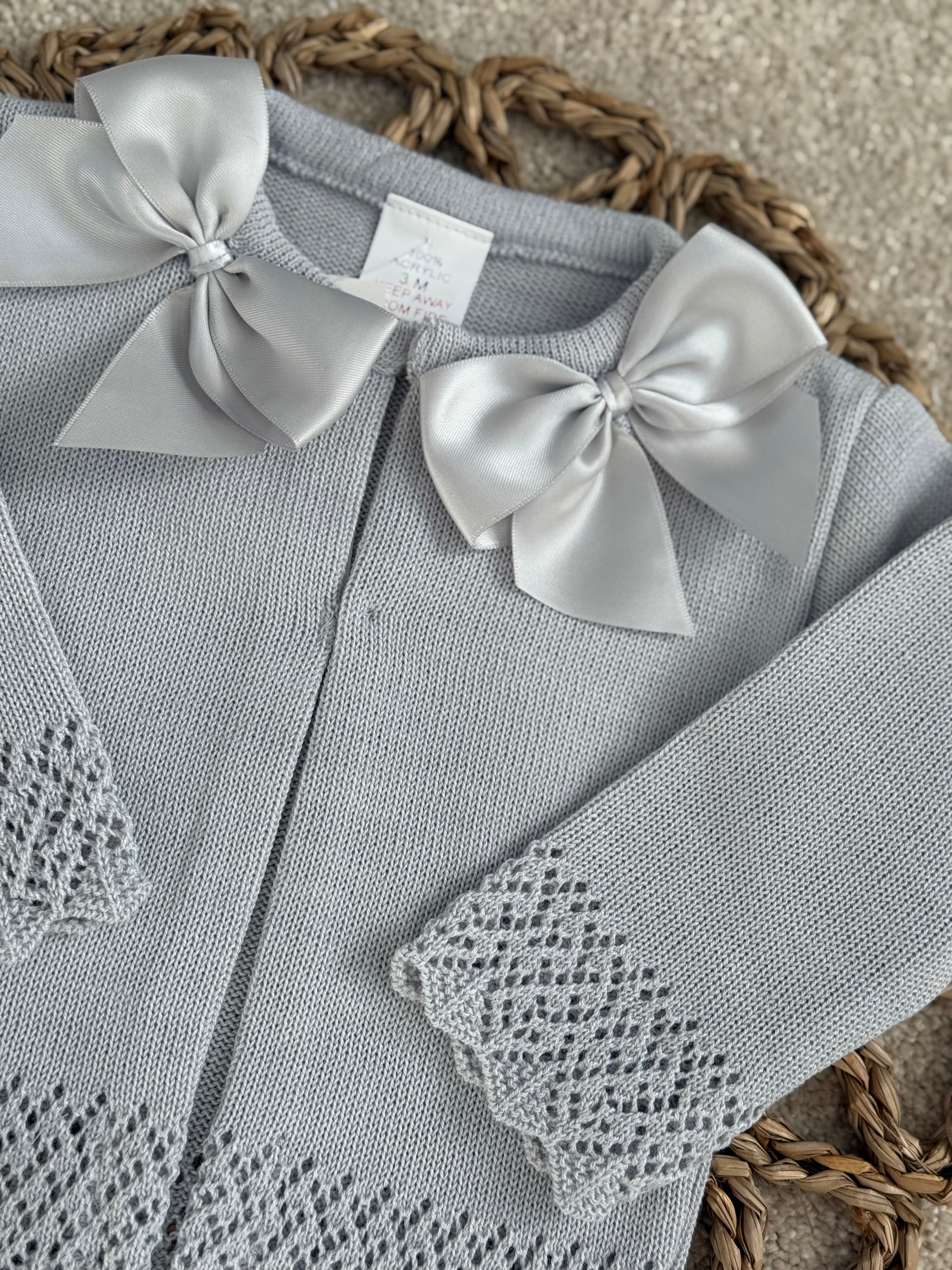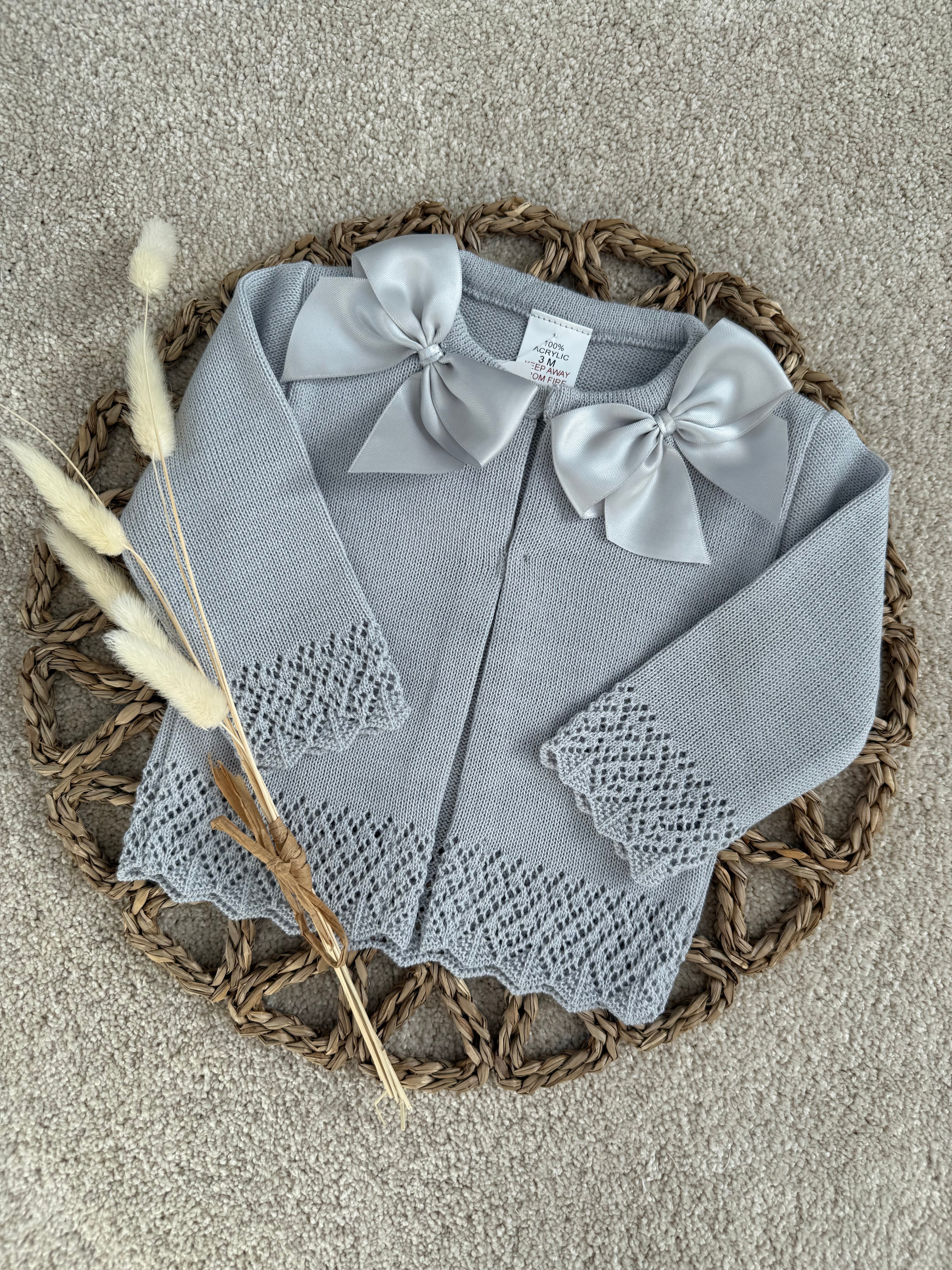 Girls knitted cardigan with 2 big satin bows on the front, this is perfect to go over anything. Available in lots of different colours.