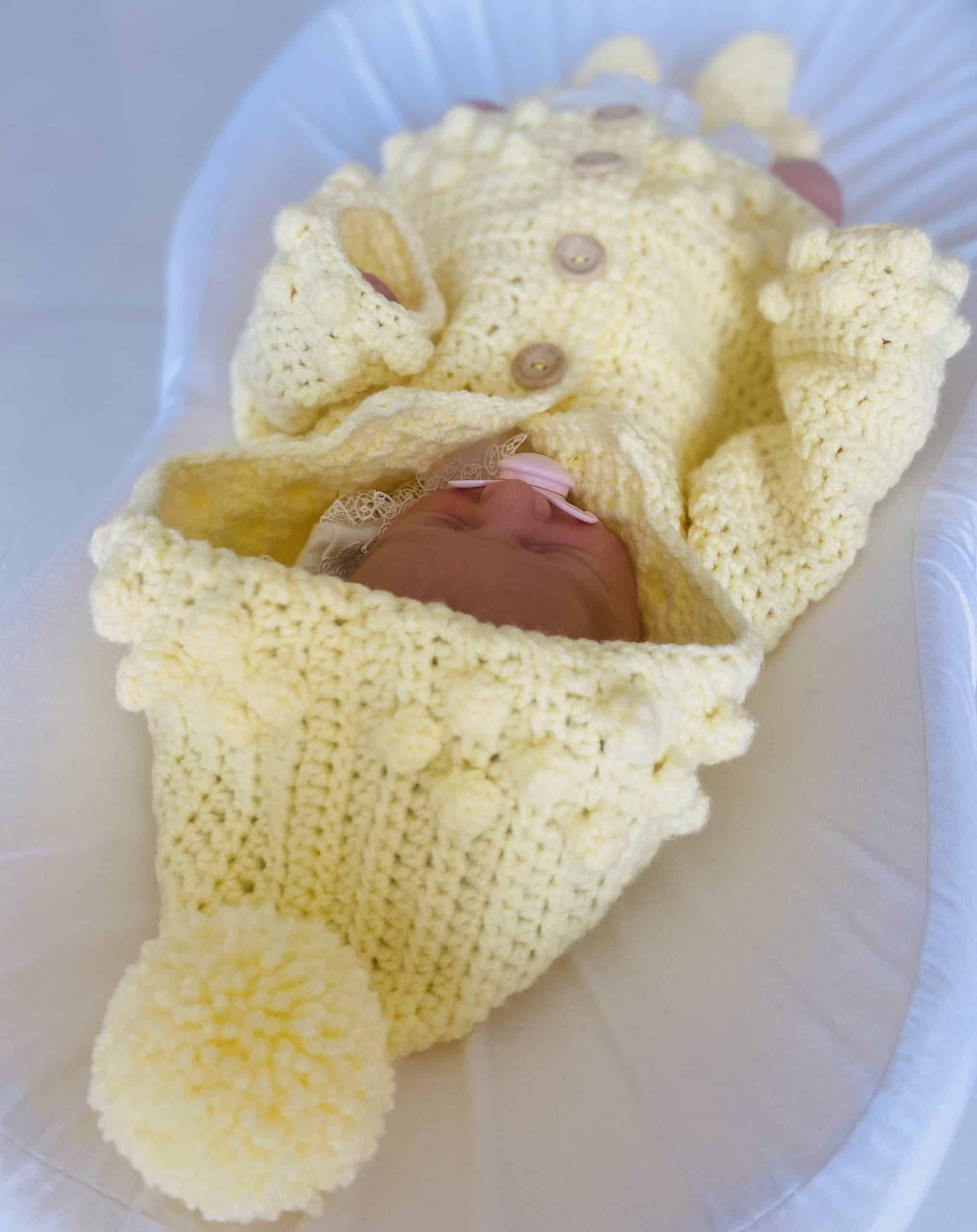 These are pre order items as these are all handmade, Please allow upto 2 - 3 weeks delivery if you want it sooner please send us a email we can try and sort something for you if possible. This set comes in Lemon, Pink, Blue & White Perfect for a gift for a newborn born baby.