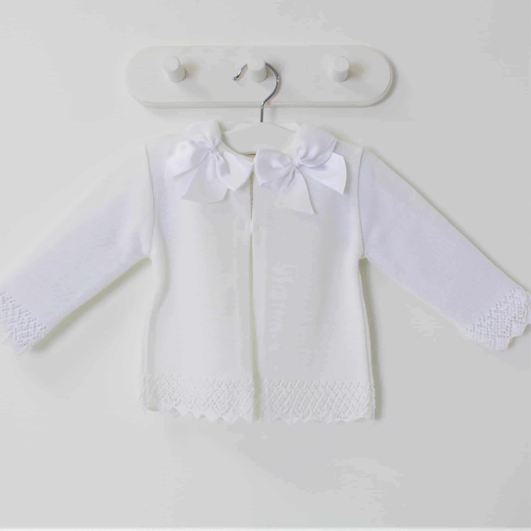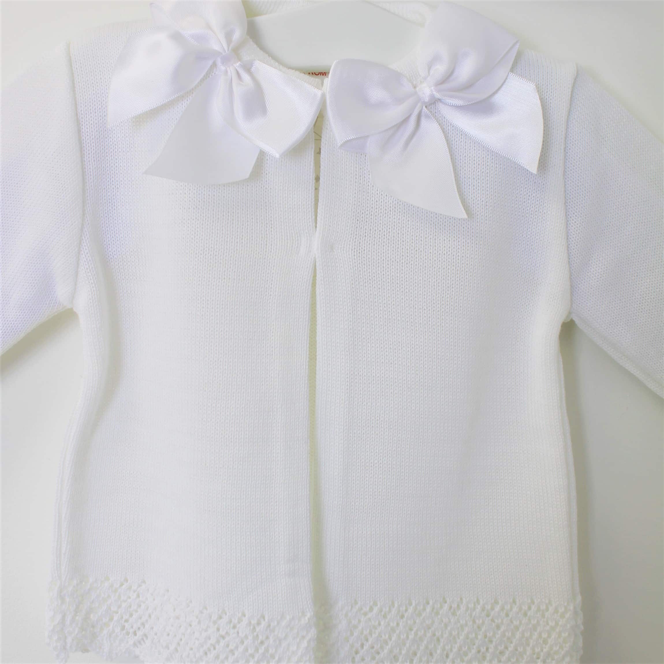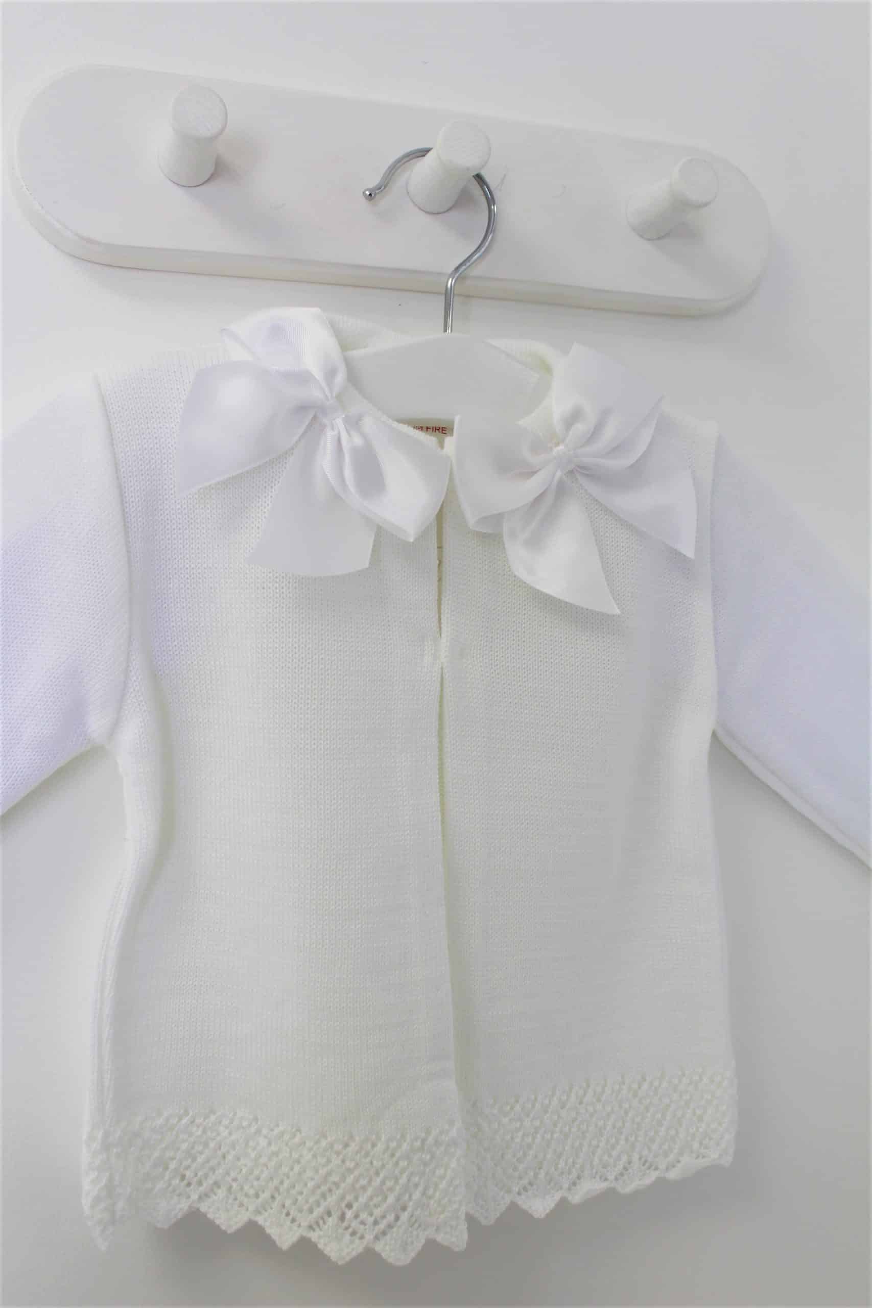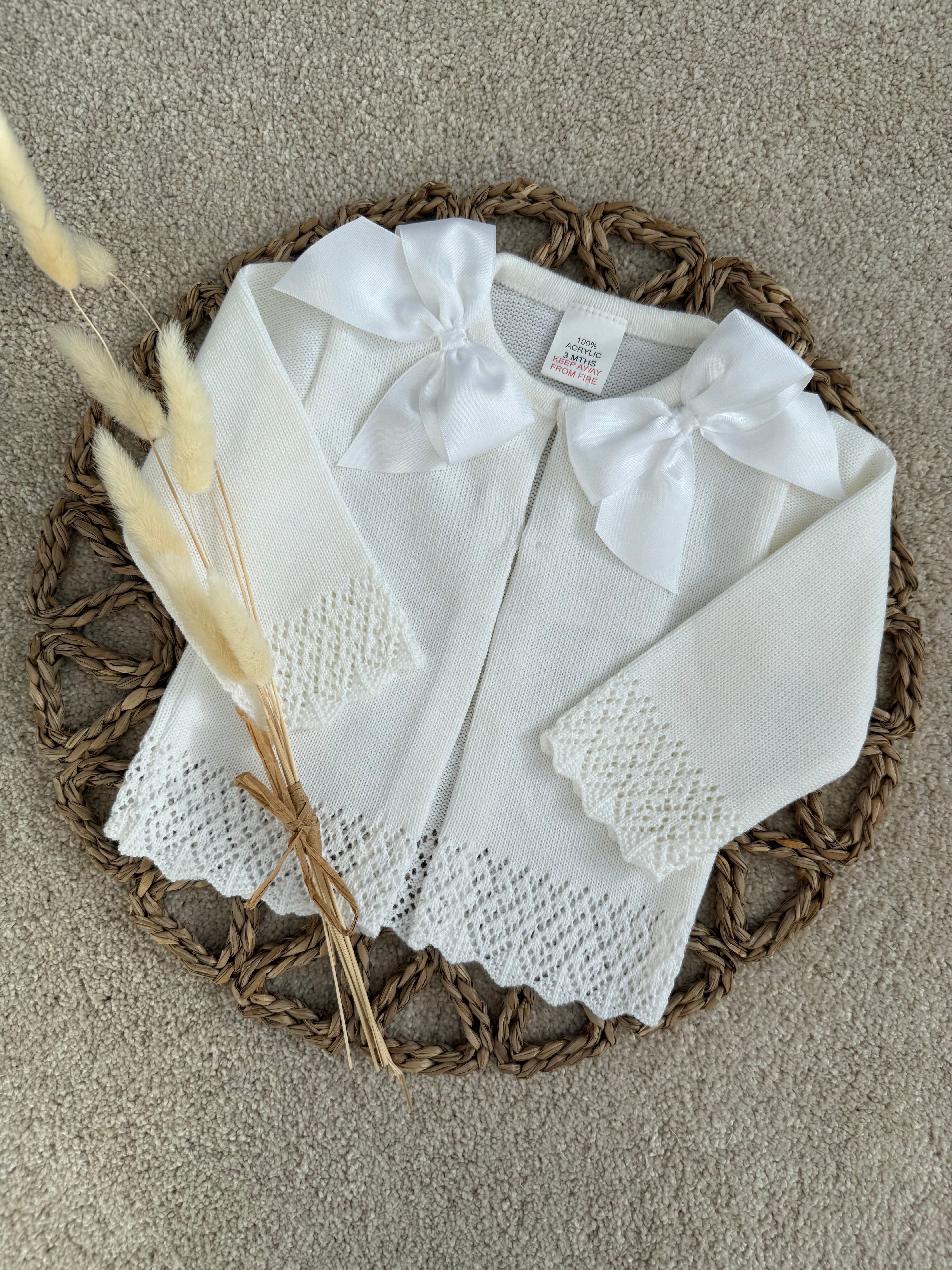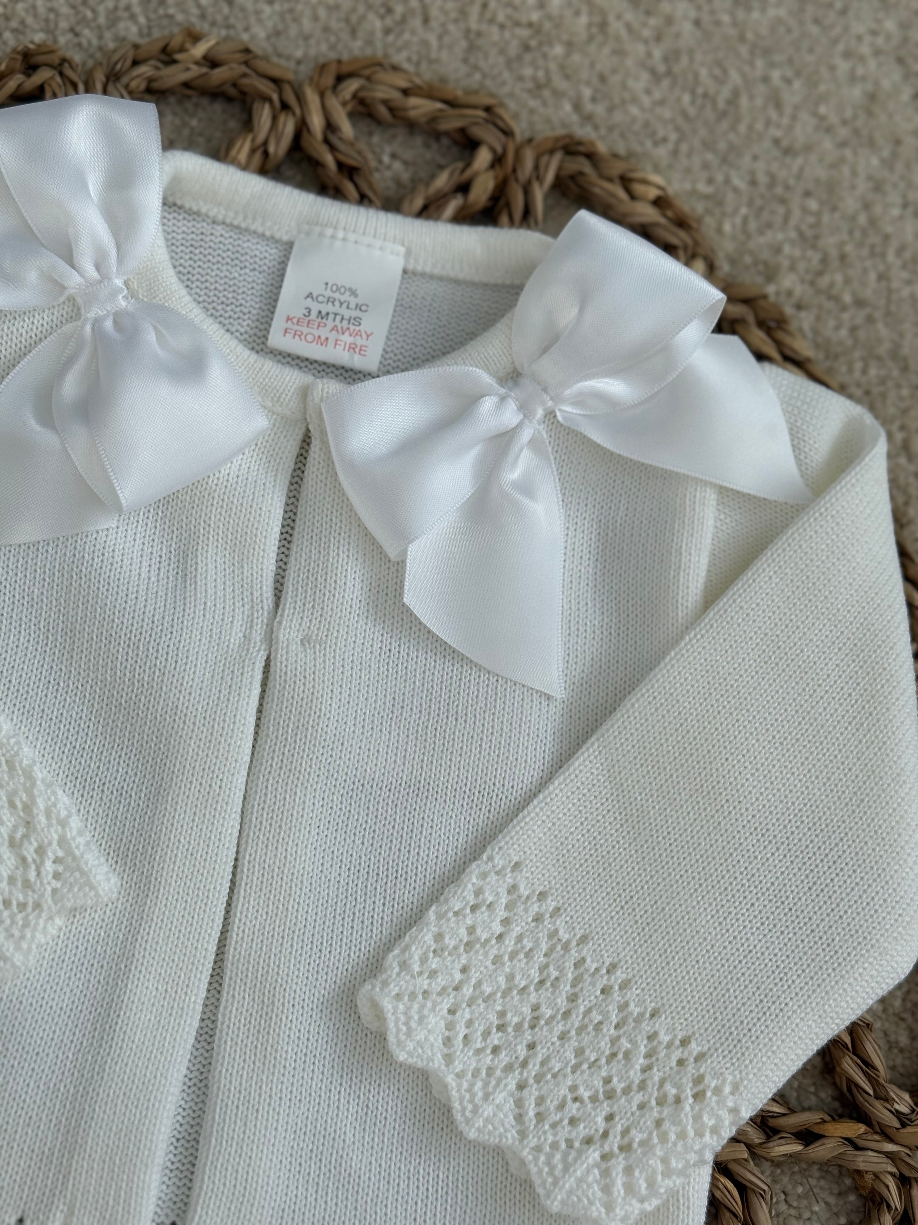 Girls knitted cardigan with 2 big satin bows on the front, this is perfect to go over anything. Available in lots of different colours.