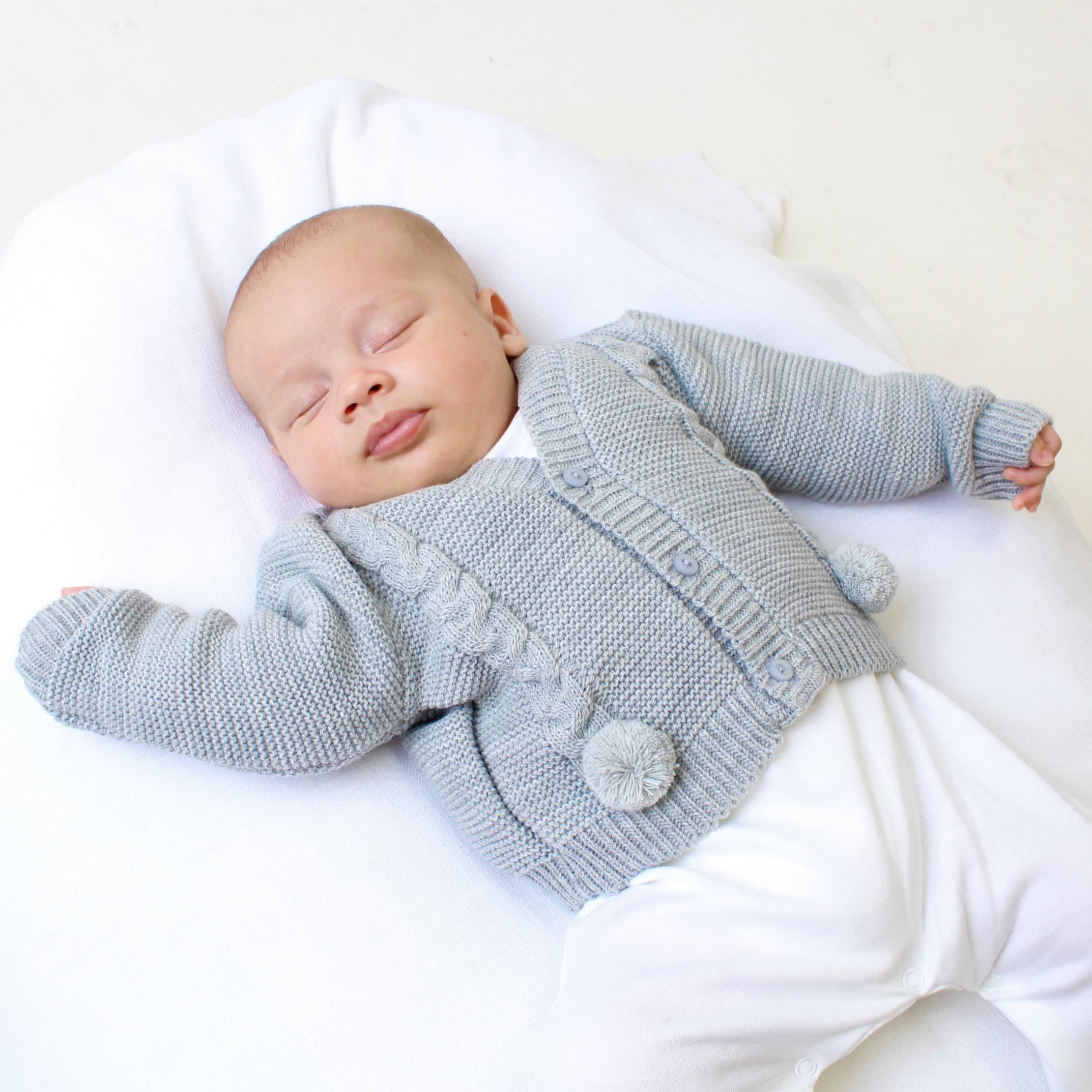 Button fastening cardigan with cable knitted trim down each side. Finished with fluffy poms at the end of the design.