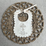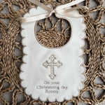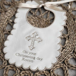 This is a beautiful unique handmade bib, with a beautiful beige stitching around and white velvet backing. Perfect for a christening and a beautiful keepsake to keep in the family.