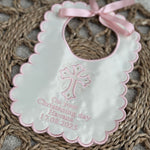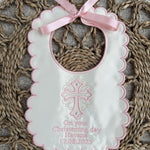 This is a beautiful unique handmade bib, with a beautiful beige stitching around and white velvet backing. Perfect for a christening and a beautiful keepsake to keep in the family.
