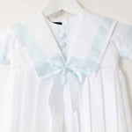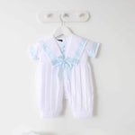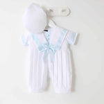 Baby boys white & blue sailor style christening romper & hat, the perfect christening outfit for your baby boys special day.
