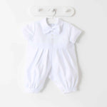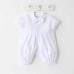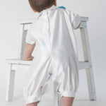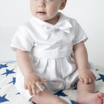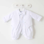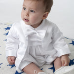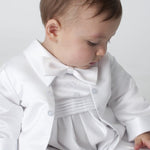 This baby boys white braid tuxedo style christening outfit, made with 100% polyester, is of an outstanding quality and will make a precious family heirloom for future generations of your family.This extra special Christening Romper is perfectly designed to ensure baby’s day is as special as it can be.This christening romper has a bowtie and 3 buttons down the front. Comes with a matching jacket.
