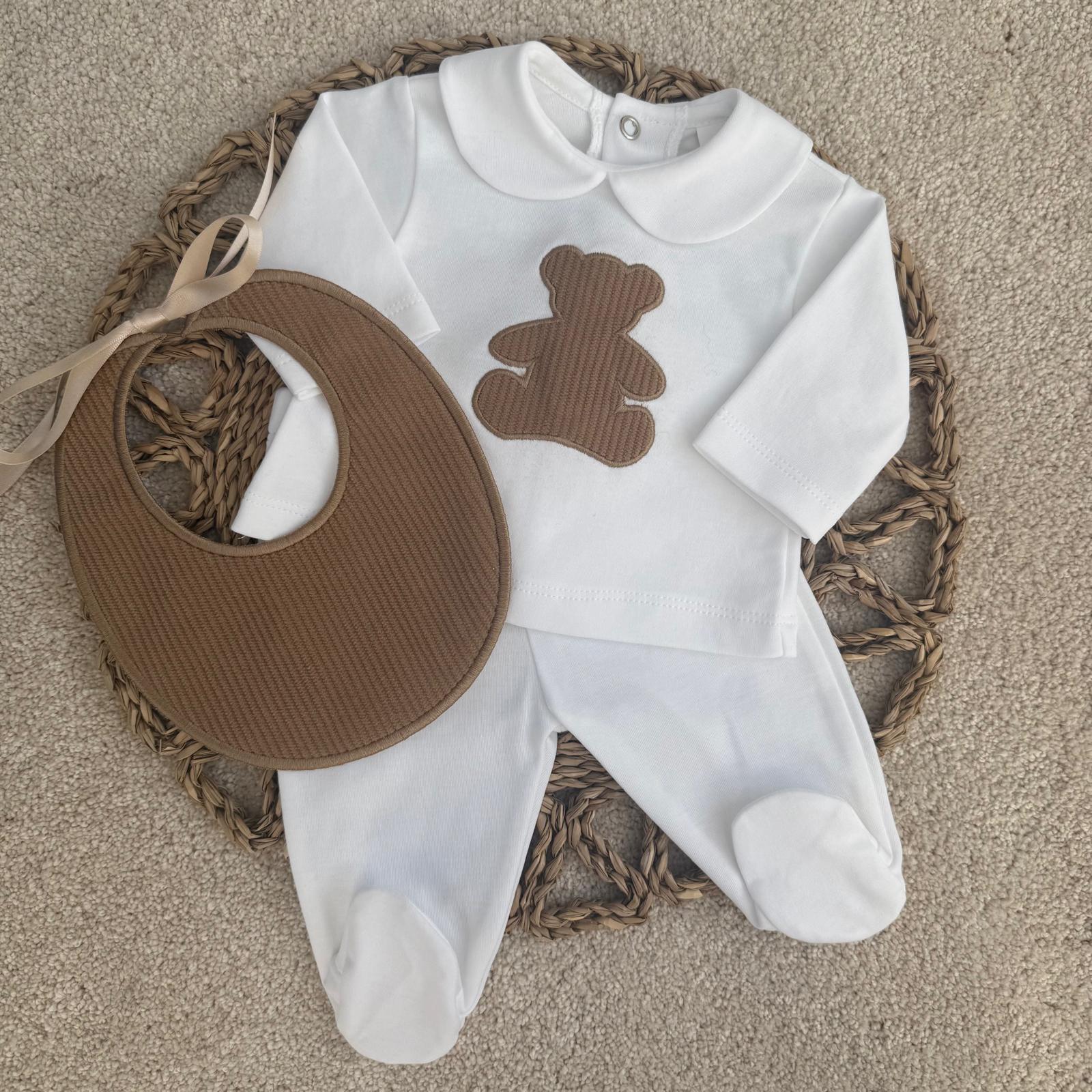 White Baby Set with Teddy Appliqué & Bib | Luxury Baby Outfit UK