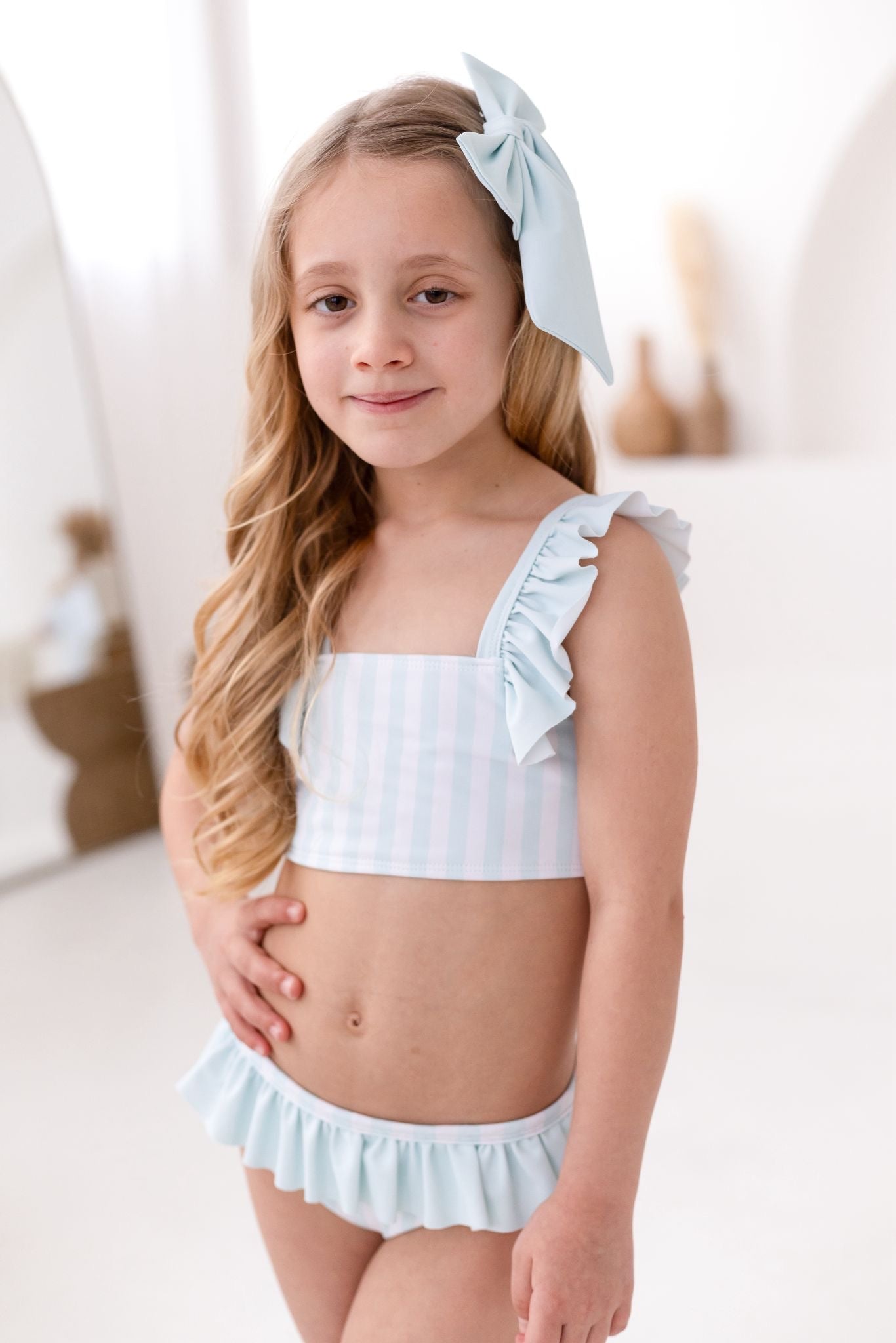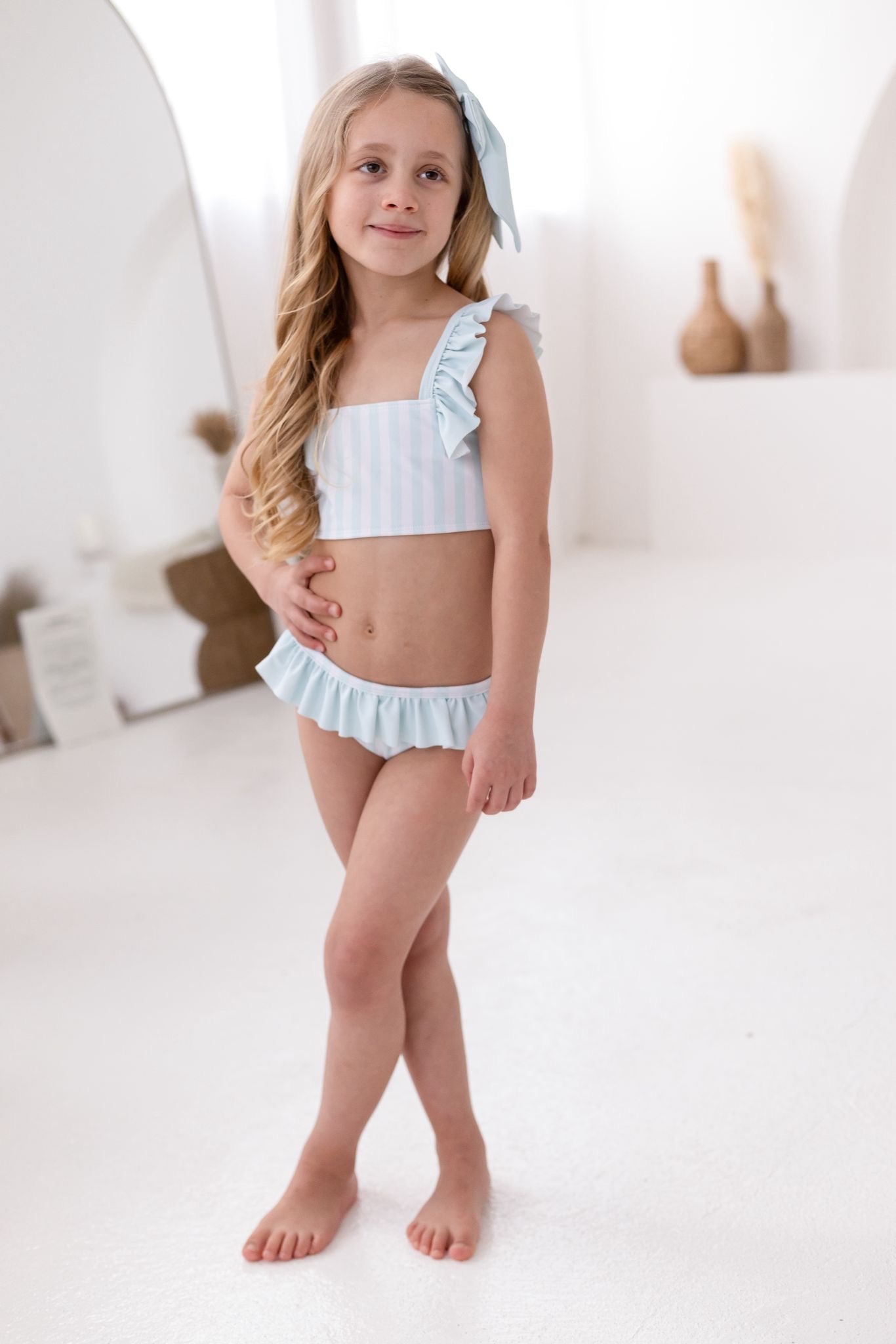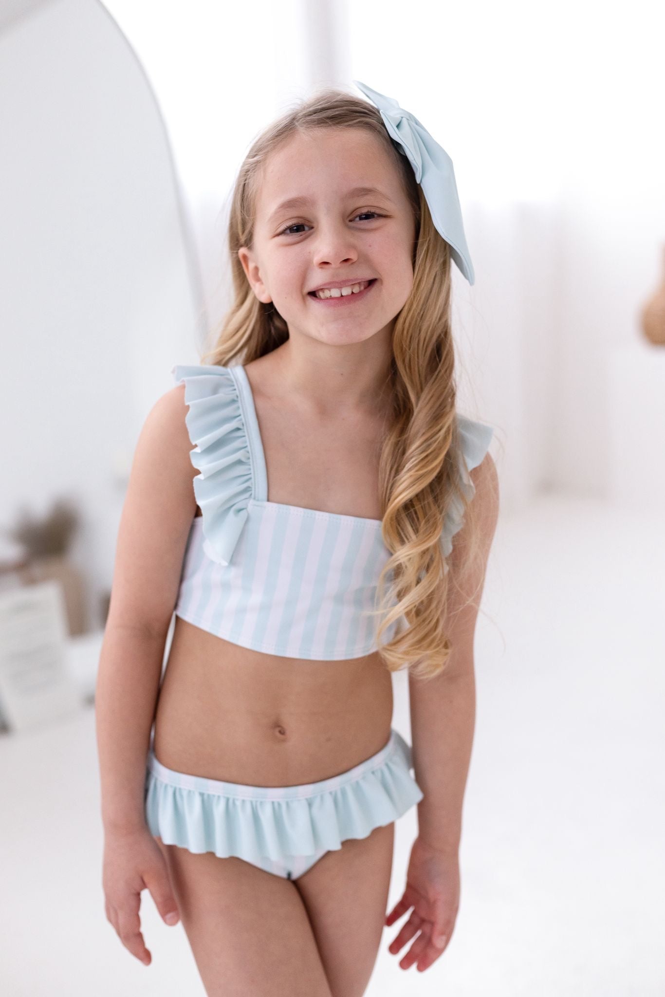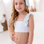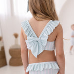 Make sunny days even sweeter with our Perfect Little Things own-brand pastel green and white bikini. Designed with a charming stripe pattern and finished with delicate Pastel green ruffle trims, this stylish two-piece is perfect for beach adventures and poolside fun.
