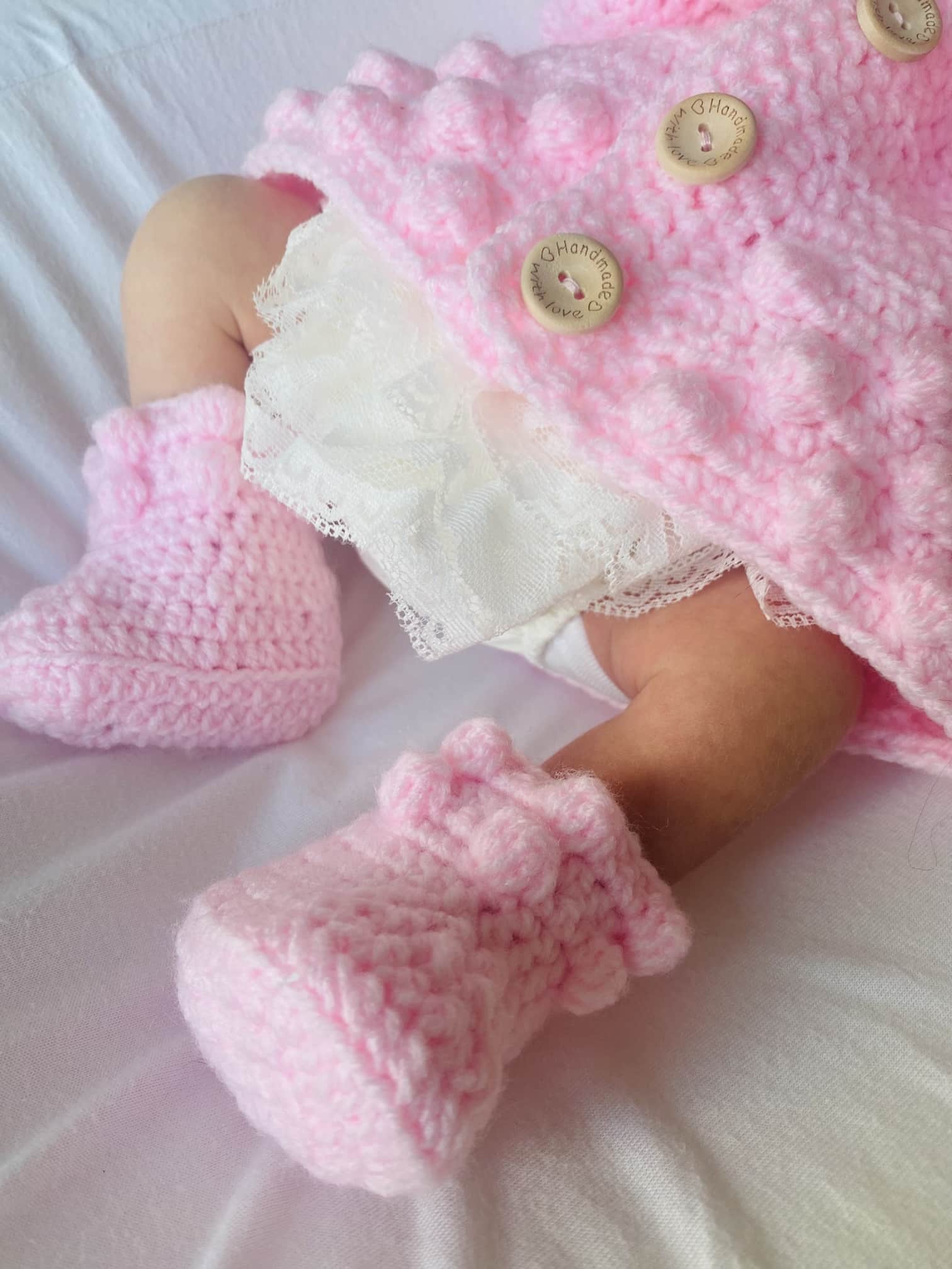 This is a beautiful handmade jacket with matching booties, these are made from very soft baby Aran yarn, can be made up to age 3-4 Years please email for details.