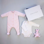 The perfect new baby gift, Tessa, is a lovely baby girls gift set. The contents are hand-selected by us with baby's comfort in mind. Inside you'll find a traditional pink babygrow, with delicate lace trim neck and integrated scratch mitts that can be folded away when not required. In addition, a white long sleeve body vest, with lace trim and pink embroidery is also included.
