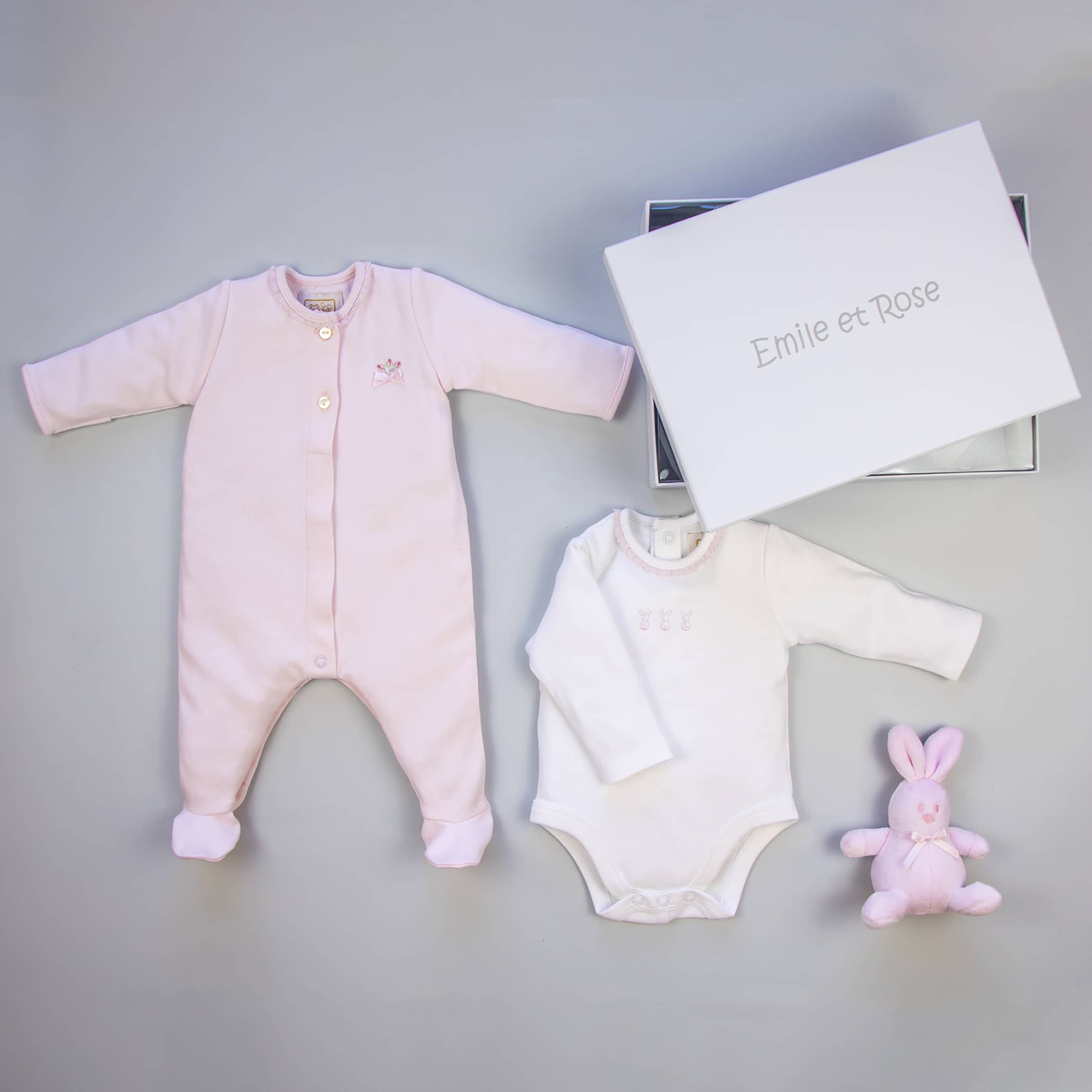 This beautiful present comes in a white gift box lined with tissue paper and a clear window adorned with the signature Emile et Rose logo and ribbon detailing. A gift card is also included (you can pop a message to be included in this at the checkout). A baby garment wooden hanger and pink Rose bunny toy are also included.