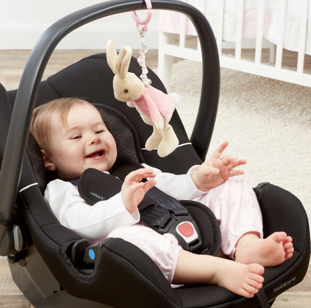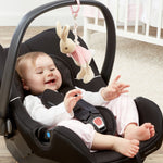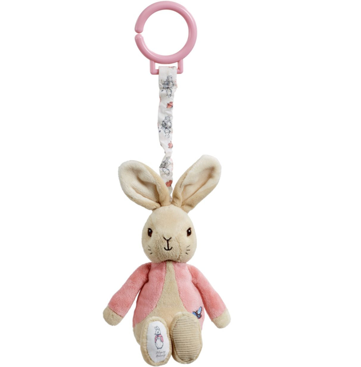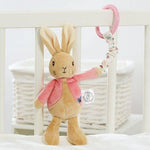 From the classic Beatrix Potter books, this Flopsy Bunny attachable toy is made from premium soft plush to ensure it is as gentle against babies skin as can be. The sturdy plastic clip enables Flopsy to be attached to baby's cot or to the baby's pram for on the go fun. Enjoy playtime more by pulling the retractable cord and watching Flopsy jiggle her way up.
