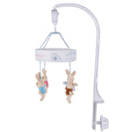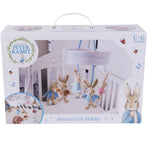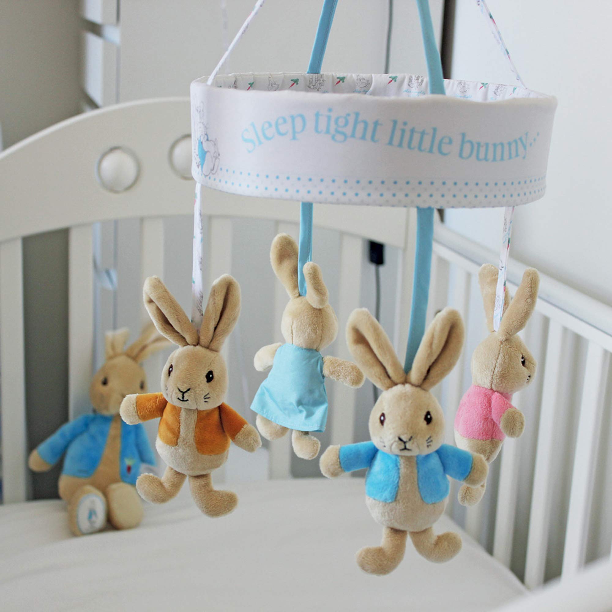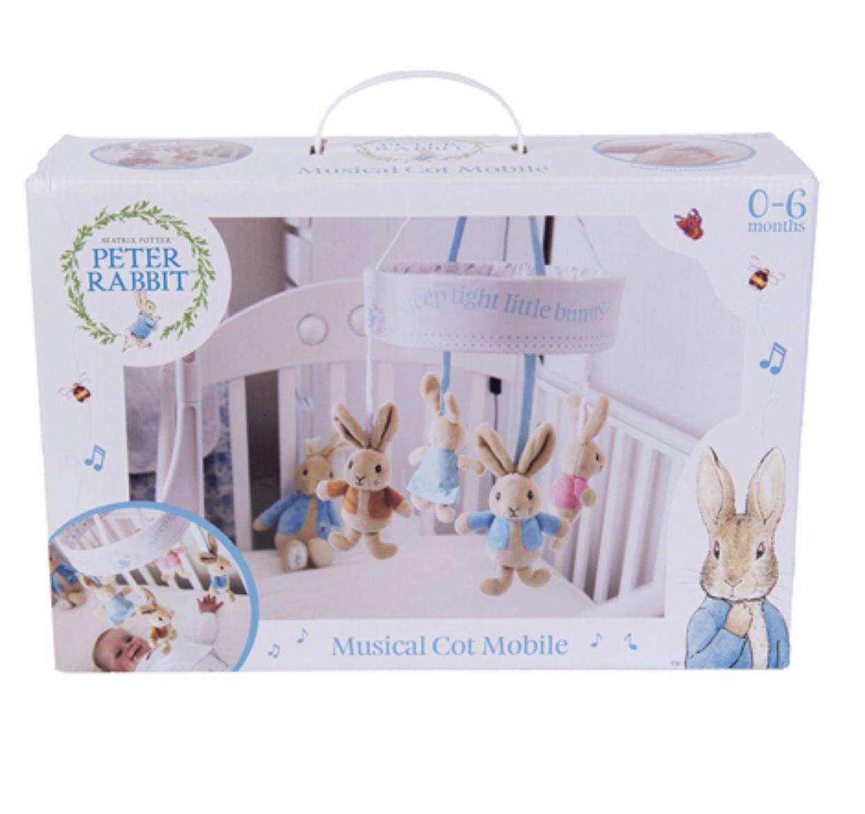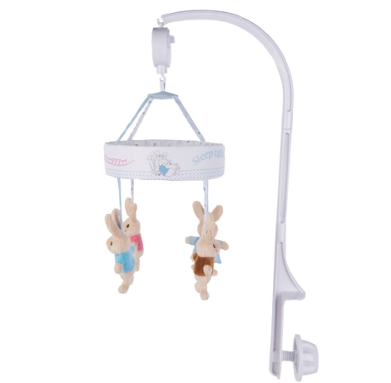 This beautiful Peter Rabbit musical cot mobile features four characters from the original tales of Beatrix Potter. Peter Rabbit, Flopsy Bunny, Benjamin Bunny and Cotton Tail hang from a circular fabric mobile with cute "Sleep tight little bunny" wording. This mobile has a traditional wind up music box and the four characters rotate gently as it plays a soothing lullaby. This mobile is easy to assemble and the plastic arm can be adjusted to fit securely between the bars of the cot.