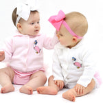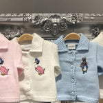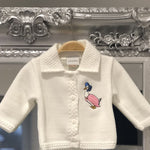 Beautiful quality traditional girls knitted cardigan from Dandelion Knitwear with Jemima Puddle Duck embroidery to chest.